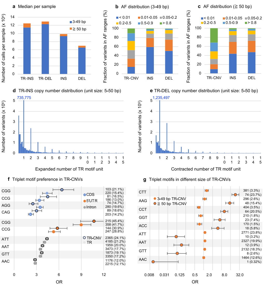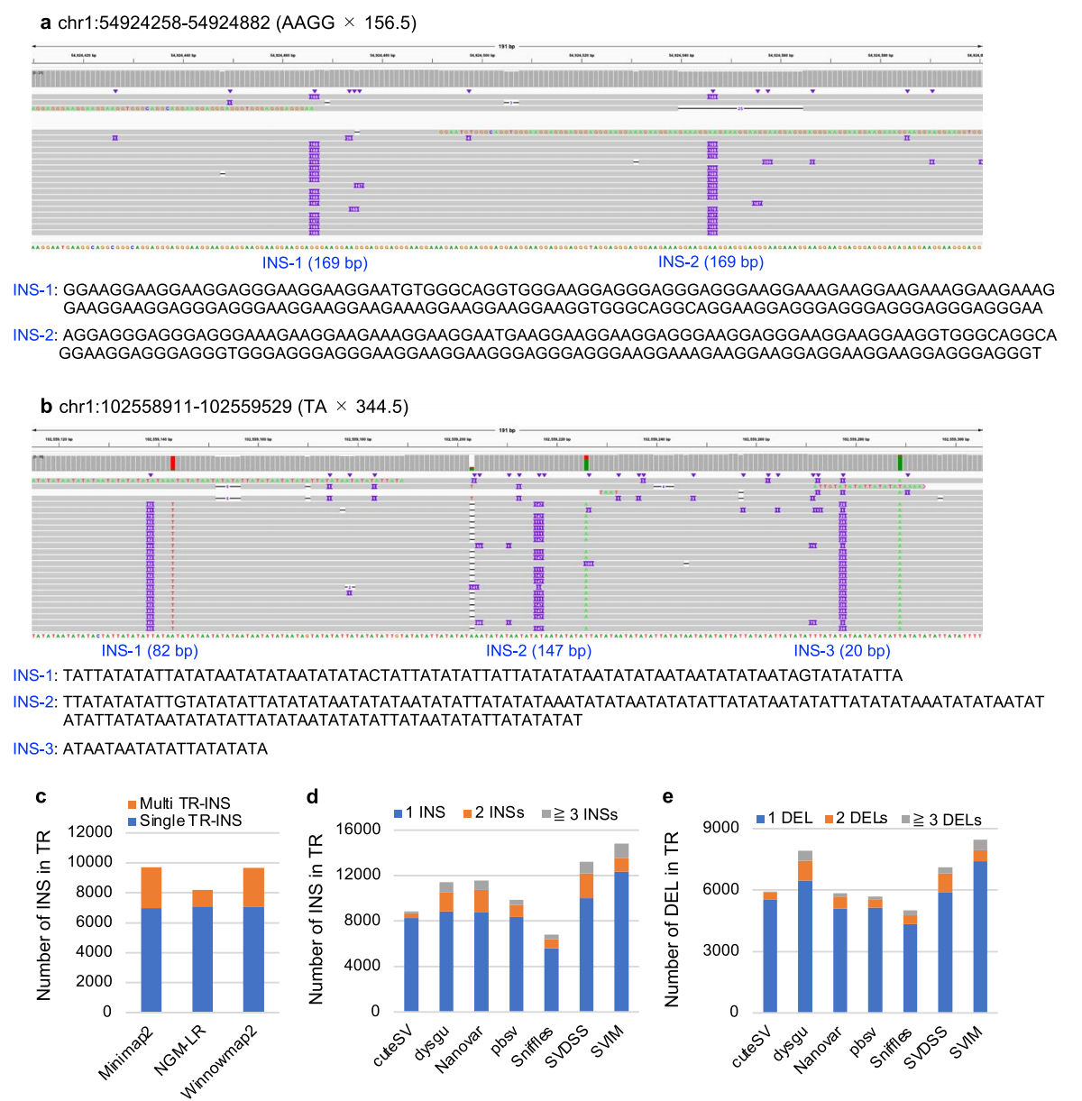 作者开发TRsv来高效检测TR区域内外的TR-CNVs、SVs以及插入缺失。该工具利用基序/序列解析的方法,分析TR区域内的TR-CNVs,并识别TR区域内的ME插入、短SVs和插入缺失。通过结合来自UCSC和HipSTR站点的TR数据,TRsv在具有≥30%互惠重叠的TR区域中进行处理,限制大小为20bp到10Kb。TRsv能够识别TR-INS或DEL,并分配为不同单倍型的TR-CNVs。