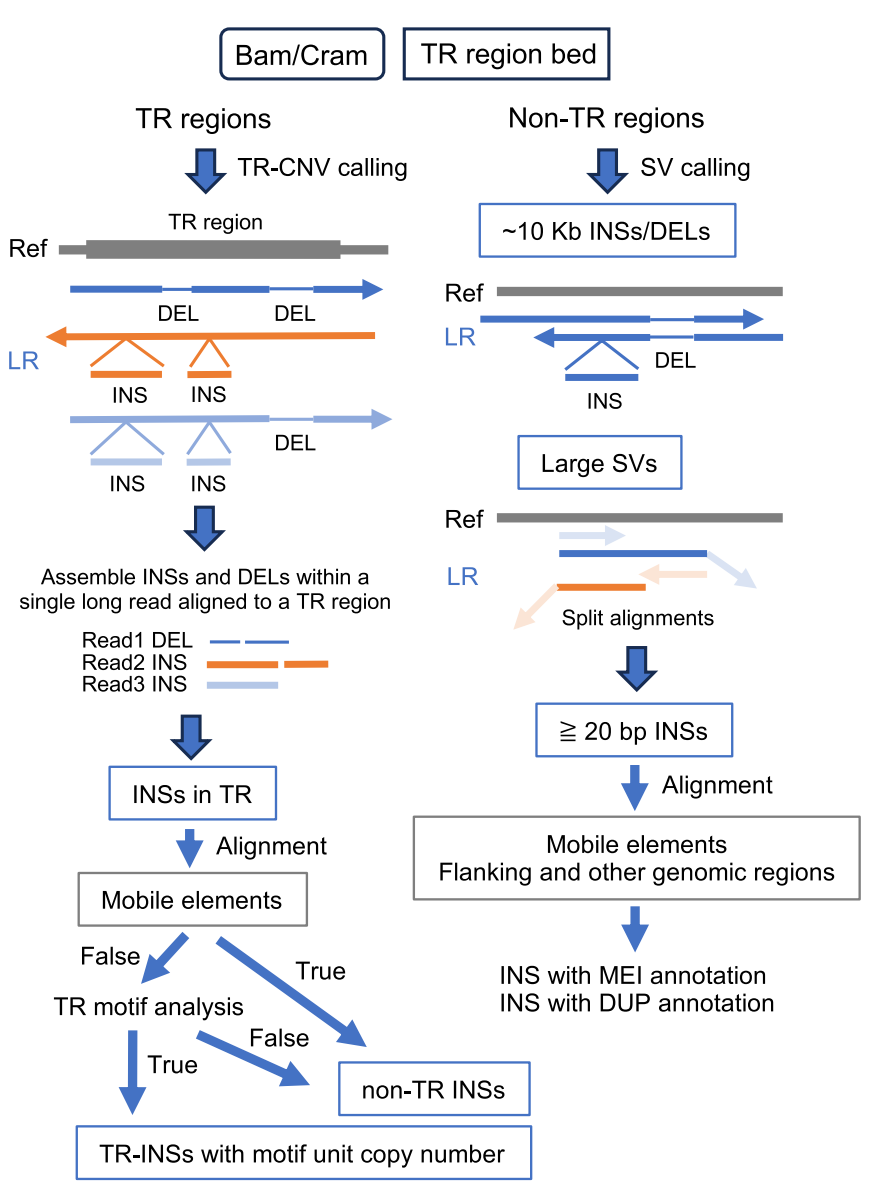 基因组结构变异和短插入缺失是基因组中重要的变异类型,尤其是串联重复(TR)区域的拷贝数变异(TR-CNVs),它们通过重复单元的扩增或收缩形成多态性拷贝数等位基因。TRs包括短串联重复(STRs,微卫星)和可变数目串联重复(VNTRs),尽管只占基因组的3%,但由于高突变率,TR区域的插入(INS)和缺失(DEL)变异频繁发生,并与多种遗传病(如神经退行性疾病、癌症)相关。