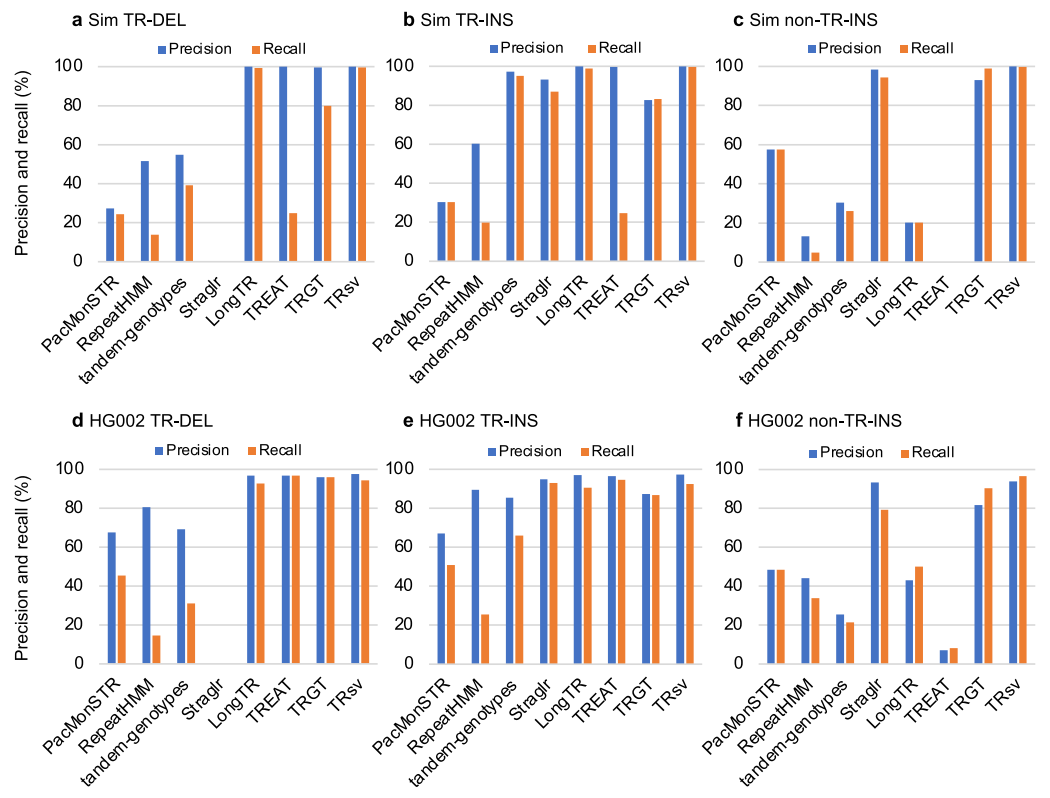 作者系统评估了TRsv及现有工具在检测串联重复拷贝数变异(TR-CNV)中的性能,包括TR缺失(TR-DEL)、TR插入(TR-INS)和非TR插入(非TR-INS)。测试分为模拟数据和真实数据,在模拟数据评估中,研究人员基于GRCh38参考基因组构建了包含1000个人工TR-DEL、TR-INS和非TR-INS的数据集。结果显示,TRsv在三个变异类型上均达到接近100%的准确率和召回率,显著优于其他工具。LongTR虽在TR-DEL和TR-INS检测中表现良好,但对非TR-INS的准确率和召回率仅在20%左右。