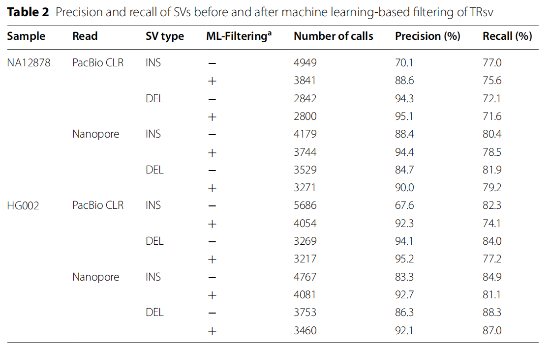 表2:在基于机器学习的 TRsv 过滤前后 SV 的精确率与召回率