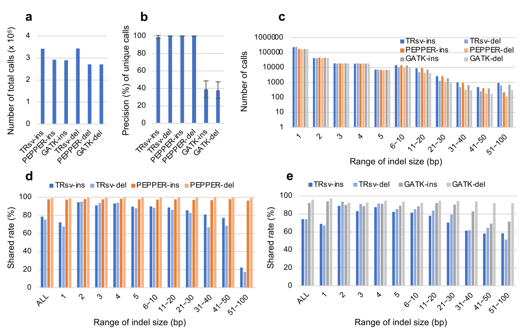 TRsv通过机器学习过滤策略,显著提升了在非HiFi数据中的检测精度。在重复序列(DUP)检测方面,该工具展现出卓越性能:不仅对大于1Kb变异具有最高的真阳性检出率,同时保持了>96%的高基因分型精度。TRsv实现了1bp的超短插入及缺失检测,与PEPPER的一致性高达97%以上。随着变异片段增大,其召回率优势更为明显。这些突破性表现证实,TRsv在结构变异检测的灵敏度、精确度和变异覆盖范围等关键指标上均超越现有工具。