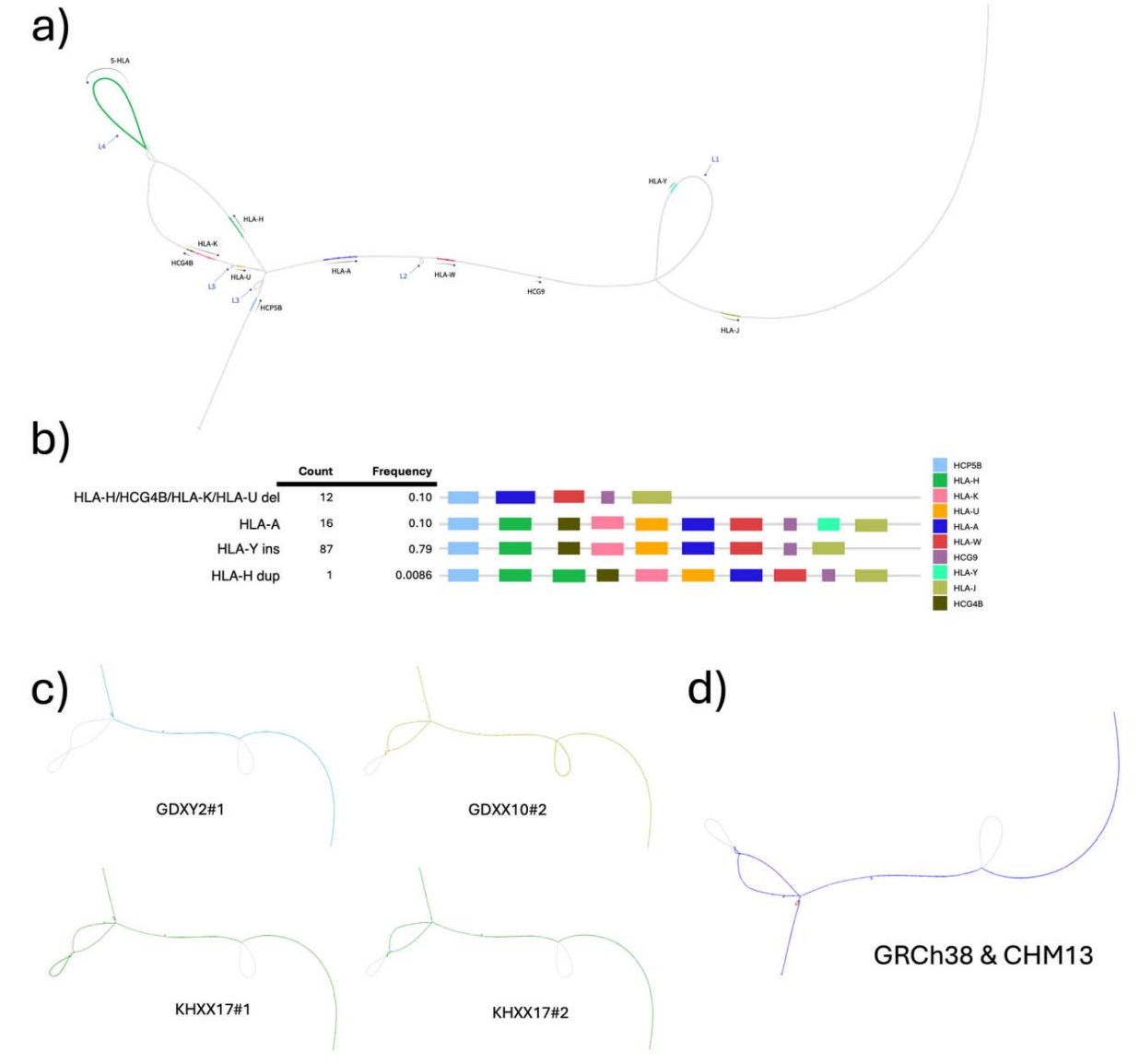 作者针对阿联酋泛基因组中HLA区域的临床相关复杂结构变异进行了特定位点分析,采用基于图的组装来解析大型多等位结构变异,并评估其相对于线性参考基因组(GRCh38、CHM13)的表现。结果表明,在阿联酋T2T泛基因组中存在五种环状结构(L1-L5),反映出跨越10个关键HLA关联基因的不同结构单倍型。L1是携带HLA-Y假基因的65.8kb插入,L4是包含HLA-H的44.0kb替代路径,这些大型环状结构的存在表明存在 GRCh38 或 CHM13v2 中未被代表的单倍型。L1的HLA-Y插入在16个单倍型中出现;跨HLA-H、HCG4B、HLA-K和HLA-U的多基因缺失在12个单倍型中检测到。L4单倍型(HLA-H插入)仅在一个个体中出现。按父母来源分析,母系单倍型对HLA-Y插入和多基因缺失的贡献均高于父系。总体来看,作者的发现与HPRC的结果一致但更具扩展意义:阿联酋人群中约65kb的HLA-Y插入频率较低,并且揭示了HPRC数据集中未捕获的结构复杂性,包括罕见的HLA-H纯合单倍型。