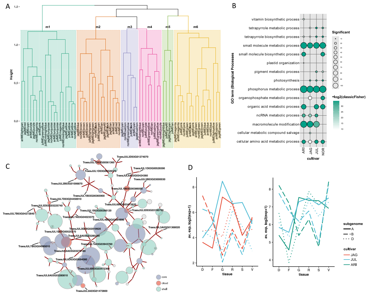 研究分析了四个小麦品种(ArinaLrFor、Jagger、Julius、Norin61)的共表达网络,以探究跨组织与品种的基因调控保守性。每个品种均基于De novo注释的高可信度基因模型构建共表达网络,覆盖约38%-46%的基因。通过层次聚类整合四个网络的68个模块特征基因,识别出六个跨品种的“超模块”(metamodules),其中五个在所有品种中共有,体现出高度的表达模式保守性。三个主要超模块(m1、m2、m6)在60%–72%的GO功能项上保持一致,富集于光合作用、磷代谢、核小体组装及细胞结构组织等核心代谢过程。较小的超模块(m3、m4)表现出品种间差异:Jagger、Julius和Norin61富集于有机酸合成,而ArinaLrFor富集于苯丙烷代谢。最后一个超模块(m5)仅存在于Jagger和Julius中,主要参与细胞内运输。整体结果表明,小麦主要调控模块在不同品种间具有显著的基因表达与功能保守性。