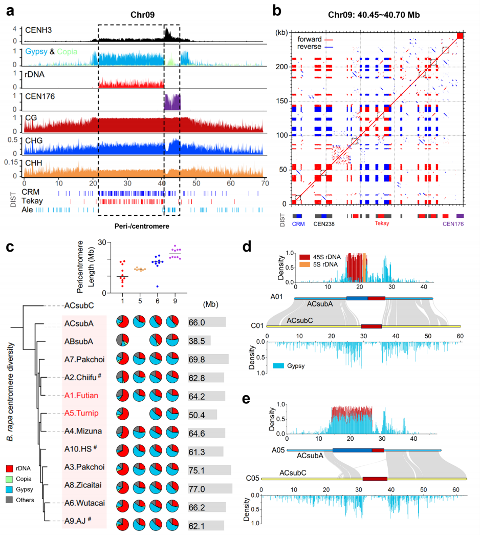 该研究发现,白菜的近着丝粒区域主要由 Gypsy 反转座子和rDNA衍生的CEN238重复组成。以CEN09邻近的250 kb序列为代表,含15个CEN238串联重复,被 CRM 与 Tekay 元件插入。部分CEN238近期被这些反转座子入侵,表明rDNA来源序列塑造了近着丝粒结构。对十二个A亚基因组的分析显示,近着丝粒在大小和组成上总体保守,仅Chr05发生部分丢失。其保守性可能因近着丝粒在白菜与甘蓝分化后才出现,也可能因其作为辅助着丝粒而演化缓慢,表现为中等CENH3富集及短着丝粒与长近着丝粒并存的特征。