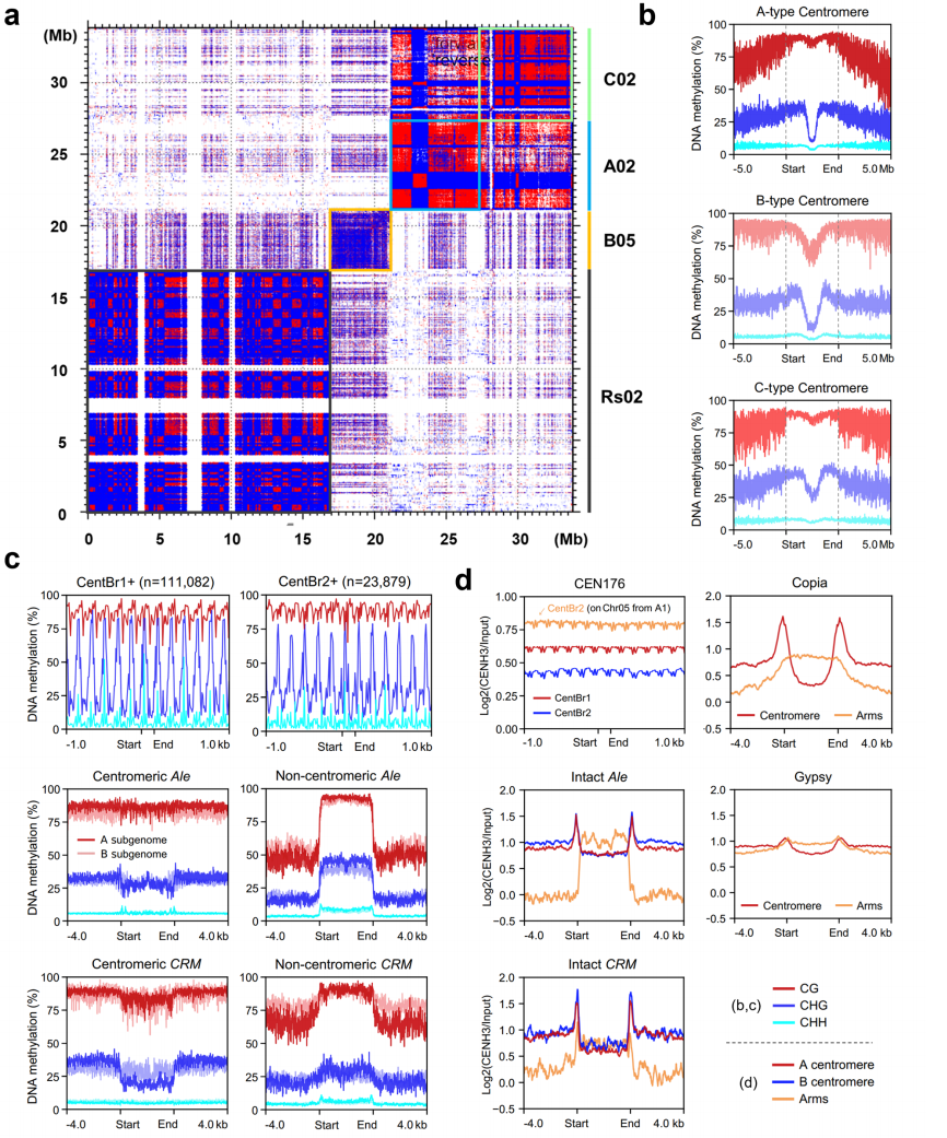 作者发现芸薹属与萝卜的着丝粒基因组景观差异显著。进一步分析显示,三种芸薹属物种的着丝粒在CG、CHG和CHH位点均呈高甲基化状态。所有类型着丝粒均存在约1.5-2.0 Mb的局部区域呈现CHG甲基化显著下降,且该区域与CENH3识别的着丝粒核心区完全重合,这说明着丝粒功能可能与CHG低甲基化环境相关。