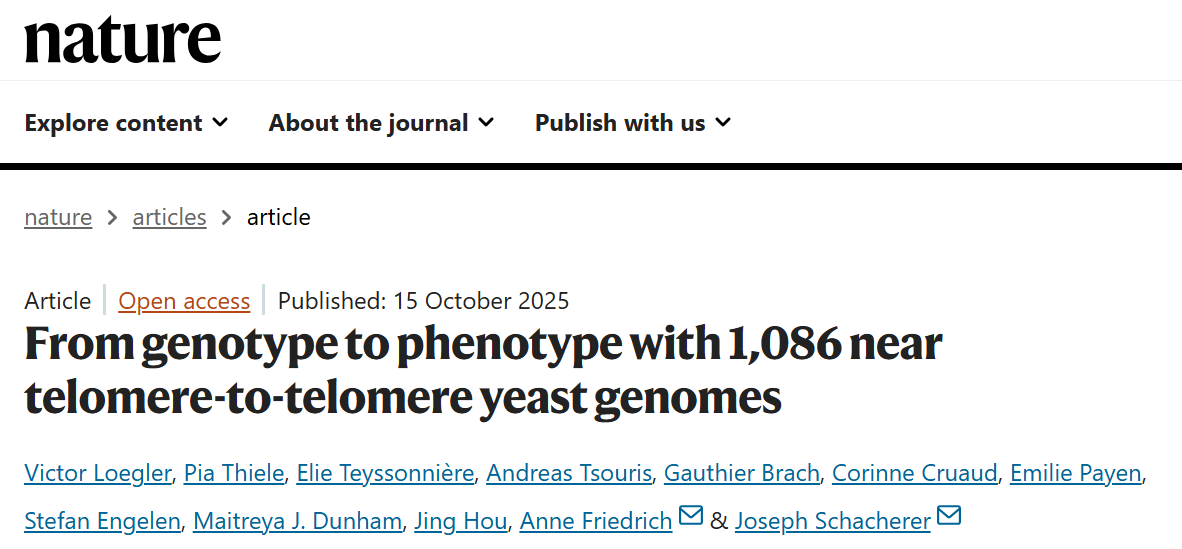 法国斯特拉斯堡大学Joseph Schacherer及其研究团队于2025年10月15日在著名期刊Nature上发表了一篇题为“From genotype to phenotype with 1,086 near telomere-to-telomere yeast genomes”的研究论文,对1086株酵母进行T2T级别的组装,在物种层面上实现结构变异和基因内容多样性的全面汇编。