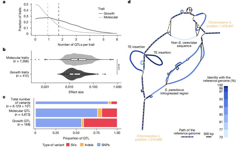 本研究基于1086个酿酒酵母天然分离株的高质量、近完整端粒到端粒基因组,对一个典型真核生物模型展开了迄今为止最为全面的遗传变异分析。通过构建这一高质量数据集,研究不仅系统鉴定了从单核苷酸多态性、短插入缺失到大规模结构变异在内的全谱遗传多样性,更深入揭示了不同类型变异在分子表型与有机体性状两个层面的差异化贡献。该工作不仅为理解表型变异的遗传基础提供了新见解,也为真核生物泛基因组研究建立了重要资源。