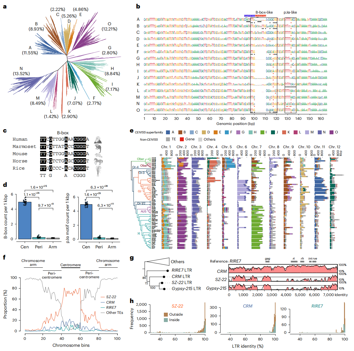 作者系统解析了水稻着丝粒卫星序列CEN155的结构特征与进化分化机制。通过全基因组注释,共鉴定出约146万拷贝,主要分布于155bp与165bp。结果显示,不同稻种间CEN155拷贝数差异显著,并形成具有方向性偏好的串联重复阵列。系统发育分析将其划分为15个超家族(SF-A至SF-O),揭示了物种间明显的进化分支。作者发现一个关键的10bp插入-缺失变异(5′-CATATATTGG-3′),可能经由重复复制与碱基替换形成类TATA-box结构,从而调控染色质状态并驱动卫星功能分化。尽管水稻缺失CENP-B基因,作者仍在CEN155中鉴定出类似人类动粒结合元件的B-box样与pJα样基序,这些元件在着丝粒中显著富集,可能承担保守的蛋白结合功能。进一步分析表明,不同染色体间CEN155的组成具有明显特异性,不同稻种中超家族比例同样存在差异,部分染色体扩张与特定单体(如SF-A、SF-N)的增加密切相关。该研究揭示了水稻着丝粒卫星序列在结构、进化及功能分化层面的复杂性,为植物着丝粒的形成与稳定性提供了新的分子基础。