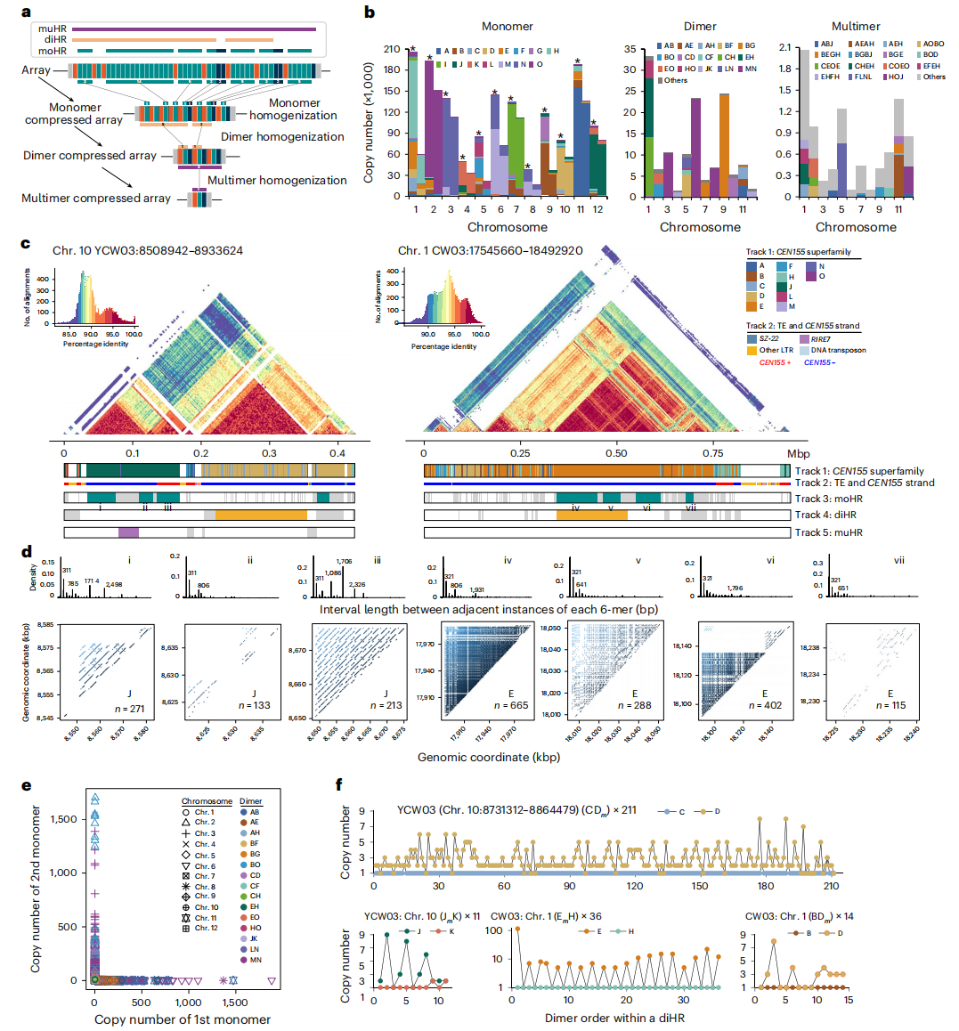 作者采用逐步压缩策略对水稻着丝粒卫星DNA阵列(CEN155)进行分析,研究发现,59.7%(约877万)的 CEN155 卫星序列位于单体同质化区域(moHRs)内,这些区域显示出高度的序列相似性,尤其在2号、3号、7号和12号染色体上尤为显著。进一步分析表明,单体并非孤立存在,而是以二聚体形式出现,且表现出一种独特的拷贝数偏向性:在一个二聚体重复单元中,一个单体的拷贝数通常固定为1,而另一个单体的拷贝数则会发生扩增,形成可变的重复次数。这种非随机的模式表明,二聚体的形成可能遵循着某种特定的规律。进一步研究发现,二聚体之间可以组合成多聚体,形成更大规模的同质化区域(muHRs)。这些多聚体主要由特定类型的卫星序列组成(如FLNL、AEA和HOJ),并且在不同染色体上分布不均。作者认为,这种在不同尺度上反复出现的、具有偏向性的局部序列扩增,是驱动着丝粒结构扩张和进化的关键机制。即着丝粒的生长并非无序复制,而是通过局部、有偏好性的重复来实现的。