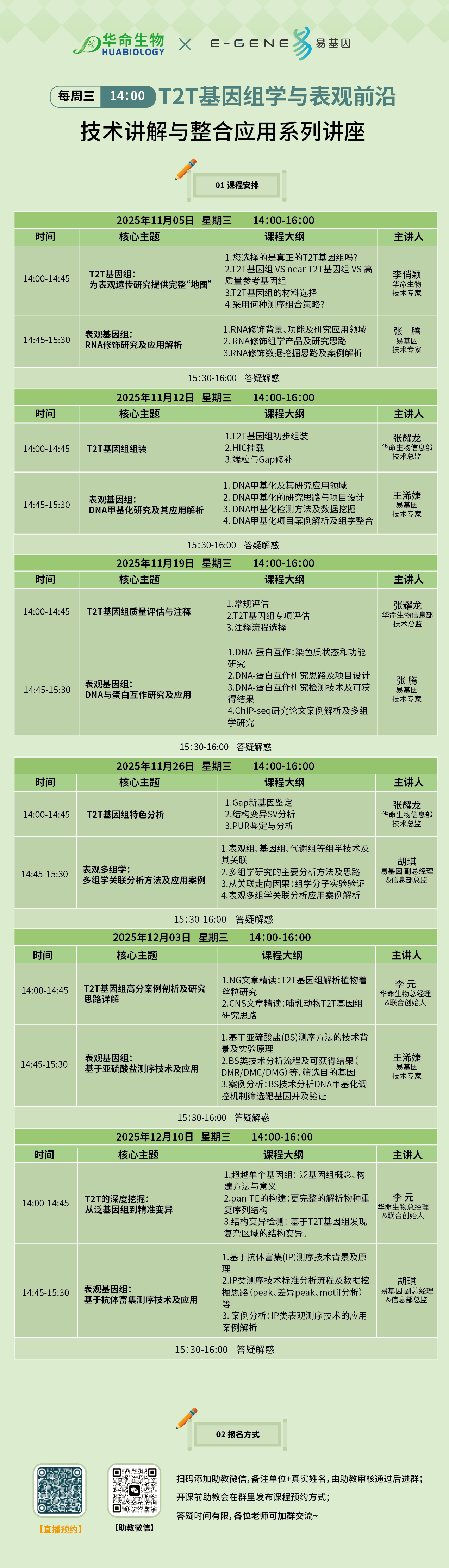在基因组学与表观遗传学飞速发展的今天,T2T(端粒到端粒)基因组 作为新一代“完整地图”,正为生命科学研究带来前所未有的分辨率与准确性。而表观遗传机制,作为基因表达的“调控开关”,如何在更完整的基因组背景下被解读,已成为众多科研工作者关注的焦点。为此,华命生物与易基因联合推出T2T基因组与表观前沿技术解析与整合应用系列讲座,2025年11月5日至12月10日期间每周三14:00开播,从技术原理到实战案例,全面掌握T2T基因组与表观多组学研究路径!