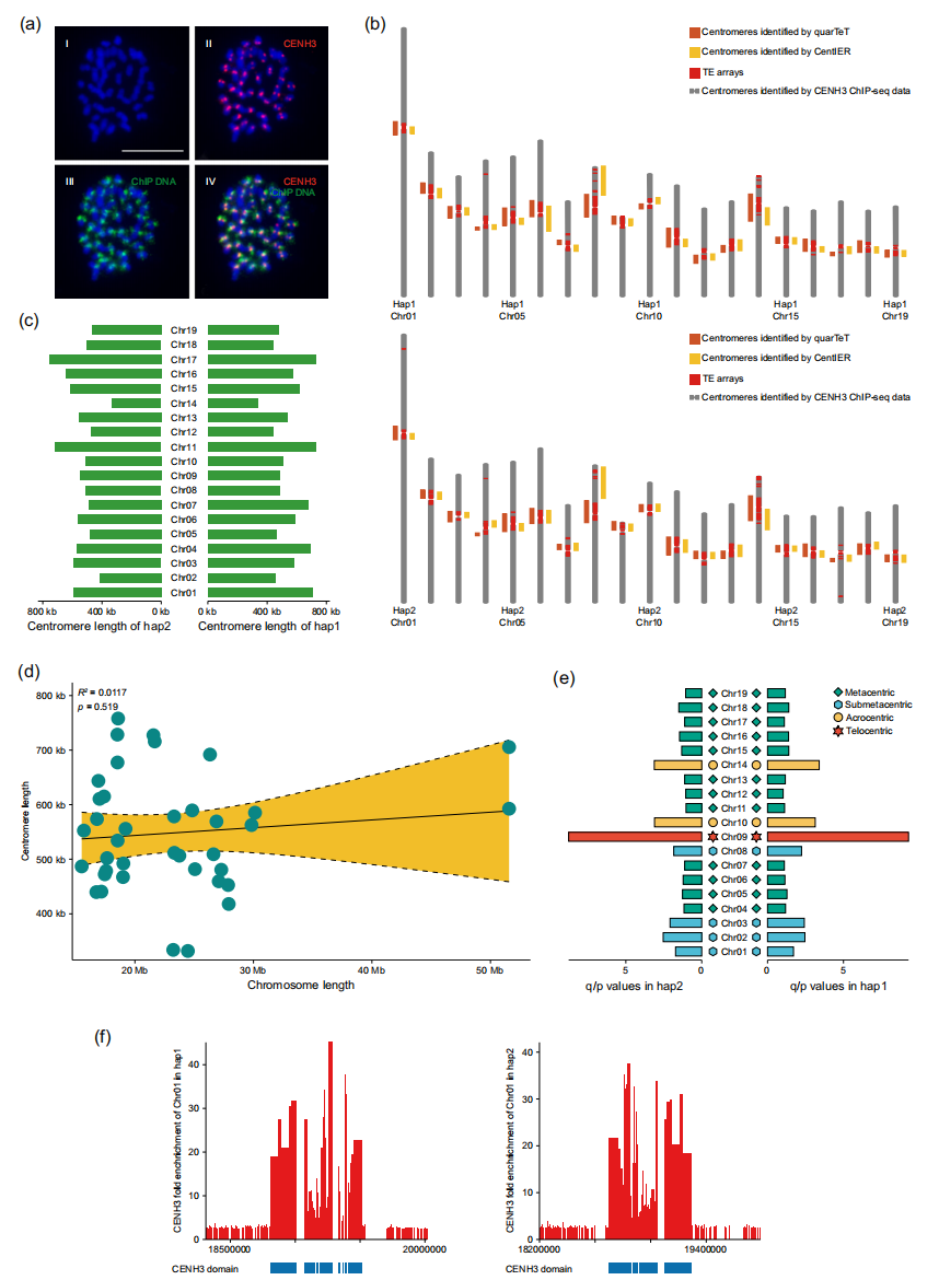 本研究在大叶杨中实现了全部38个功能性着丝粒的精确定位,确认其为典型的单着丝粒型植物。所有着丝粒均被ONT超长读段完整覆盖,在hap1和hap2中的平均长度分别为553 kb和544 kb。根据染色体臂比,大叶杨染色体可分为端着丝粒型、近端着丝粒型、中近着丝粒型和中着丝粒型,同源染色体对在两单倍型间具有高度一致的臂比值,表现出出高度保守的结构特征。着丝粒内部由交错分布的CENH3与H3富集区构成,呈镶嵌状结构,体现出反转录转座子富集型着丝粒的保守组织模式。此外,卫星与微卫星重复序列在功能性着丝粒中几乎缺失,而主要分布于近着丝粒区。在功能性着丝粒中共识别出749个蛋白编码基因,其中约115个在至少一种组织中具有活跃表达,主要参与光合作用、脂肪酸合成和过氧化物酶体功能,功能性着丝粒基因的DNA甲基化水平显著高于常染色体臂。