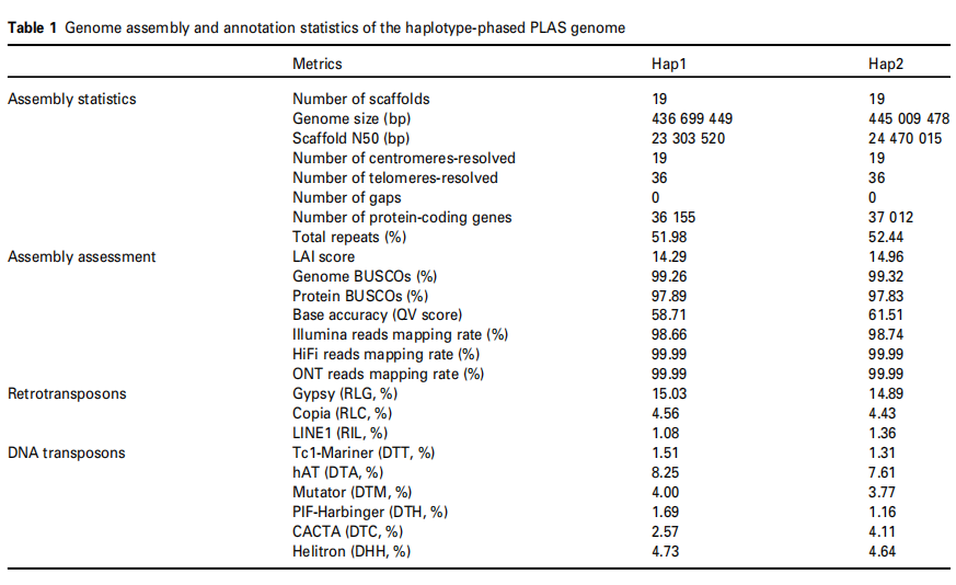 表1:单倍型阶段PLAS基因组的基因组组装和注释统计