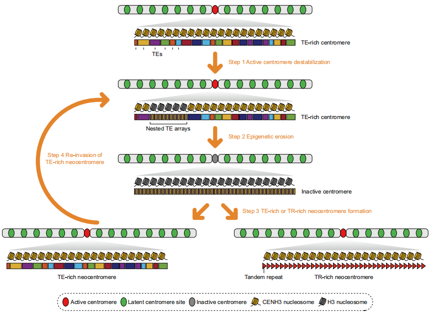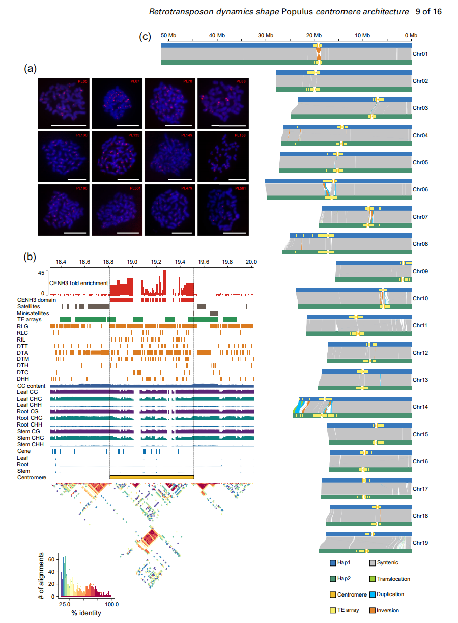 本研究完成了杨树T2T单倍型基因组的组装,重点分析了其着丝粒区的进化机制。作者发现,杨树的着丝粒并不像其他模式植物那样富含卫星DNA,而是由反转录转座子主导,尤其是富含RLG和RIL,它们在功能性着丝粒区域内形成复杂的嵌套转座子阵列,破坏了其结构完整性并驱动了其进化。作者提出了一种反转录转座子驱动的着丝粒进化模型,认为自主反转录转座子的不断转座,通过表观遗传侵蚀使功能性着丝粒不稳定,从而触发新着丝粒的形成。这些新着丝粒通常在富含转座子和串联重复的近着丝粒区域形成,并且可能随着反转录转座子的再度入侵而不断发生变动。本研究提出了一个着丝粒模式新的视角,强调了反转录转座子在植物基因组演化中的关键作用,促进了对杨树以及其他植物着丝粒多样性的深刻理解。