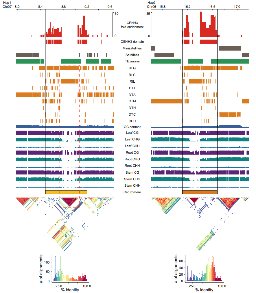 作者进一步探究了着丝粒的表观遗传特征,结果显示着丝粒区域相较染色体臂具有显著的DNA高甲基化,是跨物种保守的特征。在全部38条染色体的H3染色质区中,RLG与RIL反转录转座子形成嵌套TE阵列,而这些区域缺乏CENH3核小体结合。嵌套TE的侵入会降低DNA甲基化水平,破坏原有甲基化模式。研究表明,CENH3结合主要受表观遗传状态而非序列控制,且其信号与甲基化水平相关性较弱,说明组蛋白修饰等其他表观机制亦在CENH3结合中发挥重要作用。