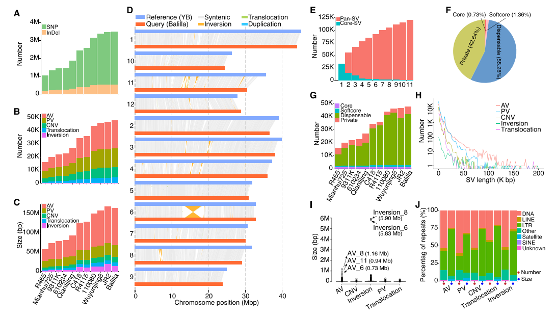 将参考基因组YB与其他自交系(ILs)比较后,检测到大量结构变异,包括存在/缺失、拷贝数变异、易位及倒位。SV的数量与长度均呈indica向japonica增加趋势,japonica含量显著更高。6号、8号染色体上发现的大型倒位其可能推动亚种分化。与泛基因组不同,泛SV在11个样本时仍未达平台期,显示其高度多样性。多数SV富集于DNA转座子和LTR区域,可能调控基因组非编码区功能。