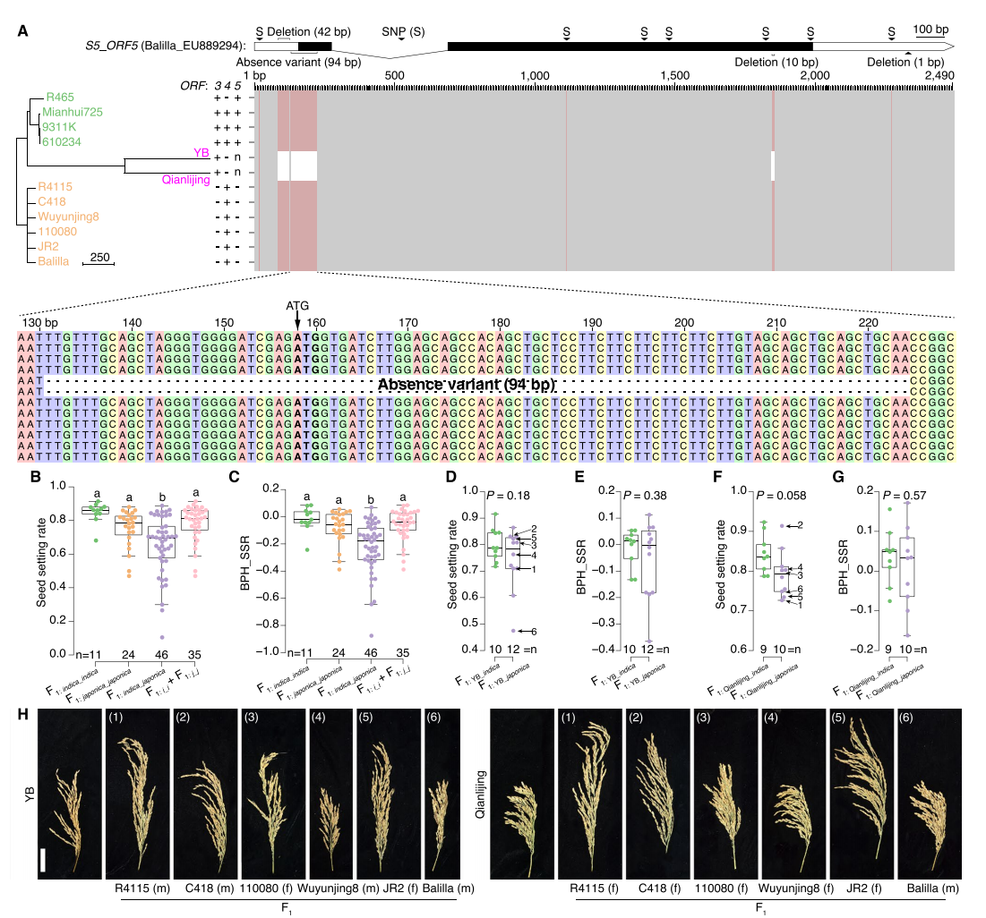 作者针对籼粳杂交不亲和关键位点S5进行了系统分析。在对S5-ORF3、S5-ORF4、S5-ORF5的序列比较中发现,YB与黔礼粳在系统发育上聚为一簇,并携带S5-ORF5中的94bp缺失变异,同时伴随10bp与42bp缺失。这些变异紧密连锁,仅存在于两者中,被认为能移除杀伤效应,使籼粳F₁胚囊得以存活,因此被鉴定为广亲和品种(WCVs)。功能验证表明一般籼粳F₁结实率显著低于籼籼与粳粳,但当YB或黔礼粳作为亲本时,其籼粳F₁结实率与籼籼F₁相当,杂种优势亦同步提升。由此证实YB与黔礼粳为籼型广亲和品种,且94bpAV是提升籼粳结实率与杂种优势的关键因素。