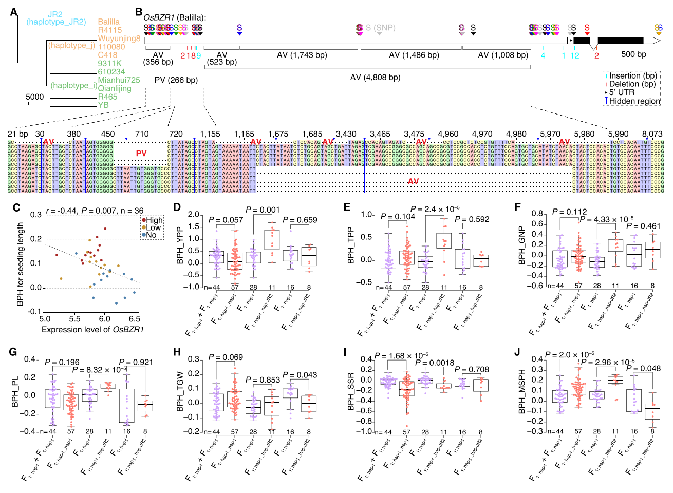 研究鉴定出OsMADS1的三个单倍型,并检测到多种SNP和结构变异。进一步分析表明,由不同单倍型构成的杂合F1在产量上显著优于同型组合,说明OsMADS1的杂合性对杂种优势形成具有重要作用。作者同时关注到OsBZR1,这一油菜素内酯信号通路的关键因子参与了籼稻和粳稻的表型分化,其启动子中存在重要的4808bp反转座子插入。系统发育分析将OsBZR1分为籼型、粳型和JR2型,并检测到82个SNP、266bp的粳稻特有变异以及4808bp的籼稻特有变异等多种类型。表达分析显示,粳稻的OsBZR1表达显著高于籼稻,并且亲本表达量越低的组合,其F1杂种优势越强。