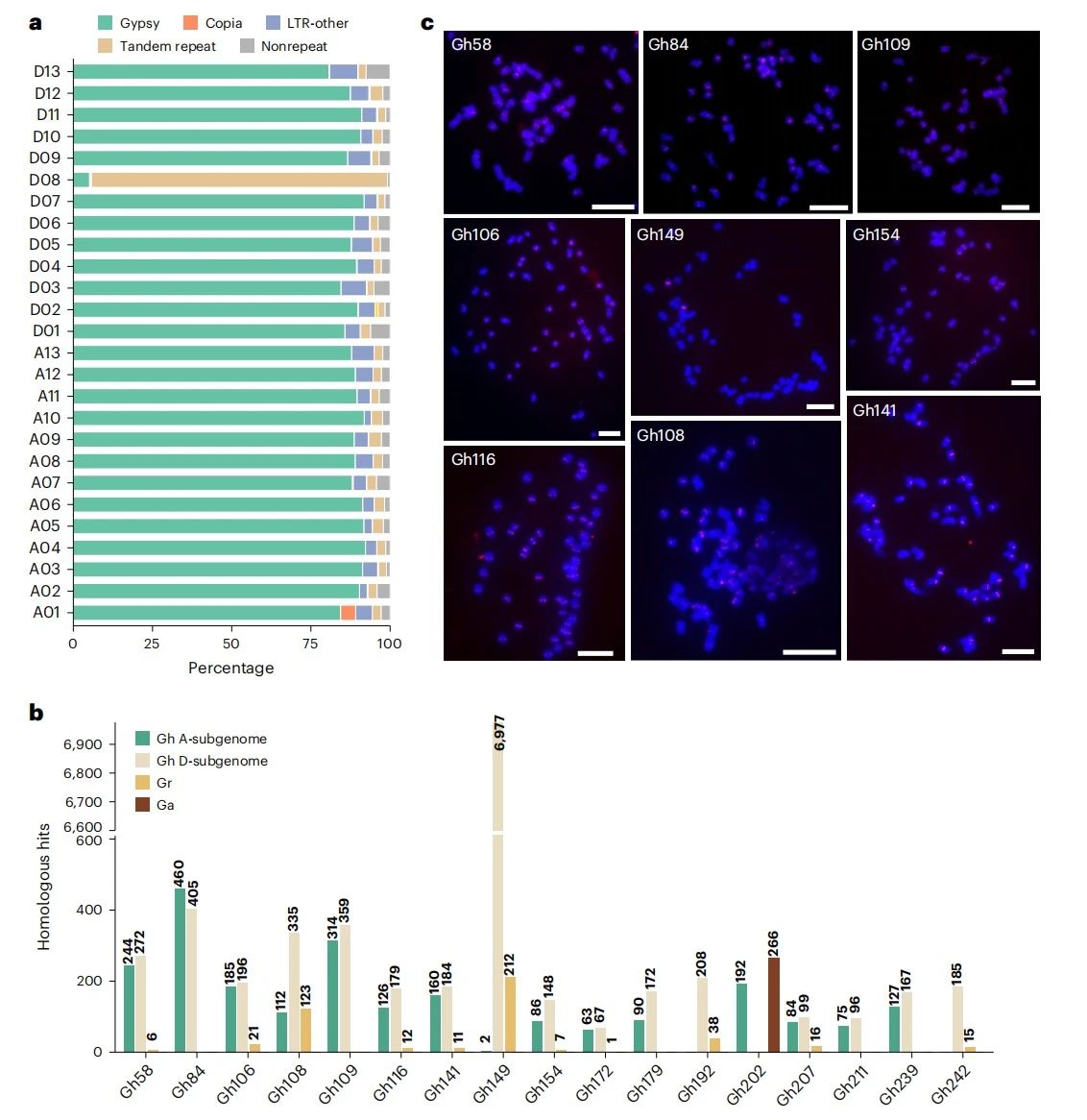 作者发现,17个着丝粒重复序列中有6个在A亚基因组和D亚基因组间富集差异显著,其中5个在D亚基因组中富集,1个(Gh202)在A亚基因组中特异性富集。这表明大多数着丝粒重复序列在拷贝数上保持平衡,但部分重复序列在进化中经历了显著富集。