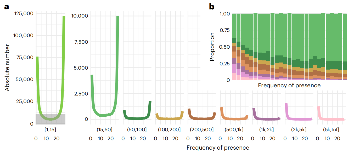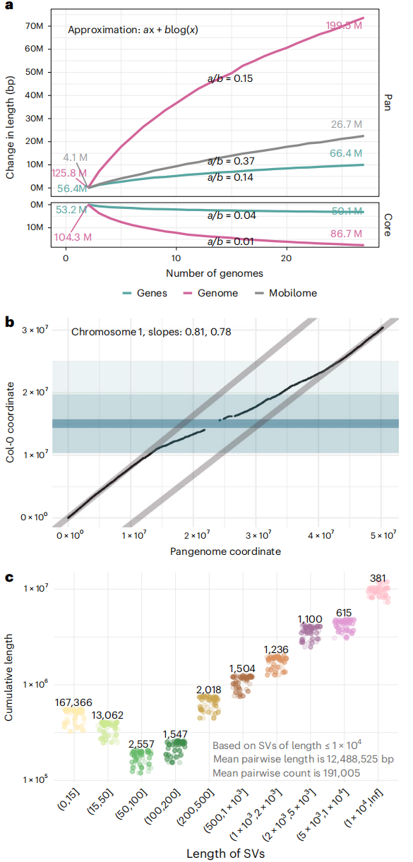 在拟南芥的研究中,作者发现泛基因组随样本数量增加而呈现差异化增长趋势:可移动元件的扩增速度快于完整基因组,而基因部分因受更强的纯化选择而增长较慢。作者进一步推测,整体增长速度高于恒定种群中性进化下的对数模式,但低于指数扩张种群中的线性预期;同时,变异的空间分布并不均衡,主要集中在着丝粒区域。研究结果显示,仅在27个拟南芥群体样本条件下,泛基因组染色体长度较TAIR10参考基因组延长高达63-76%。