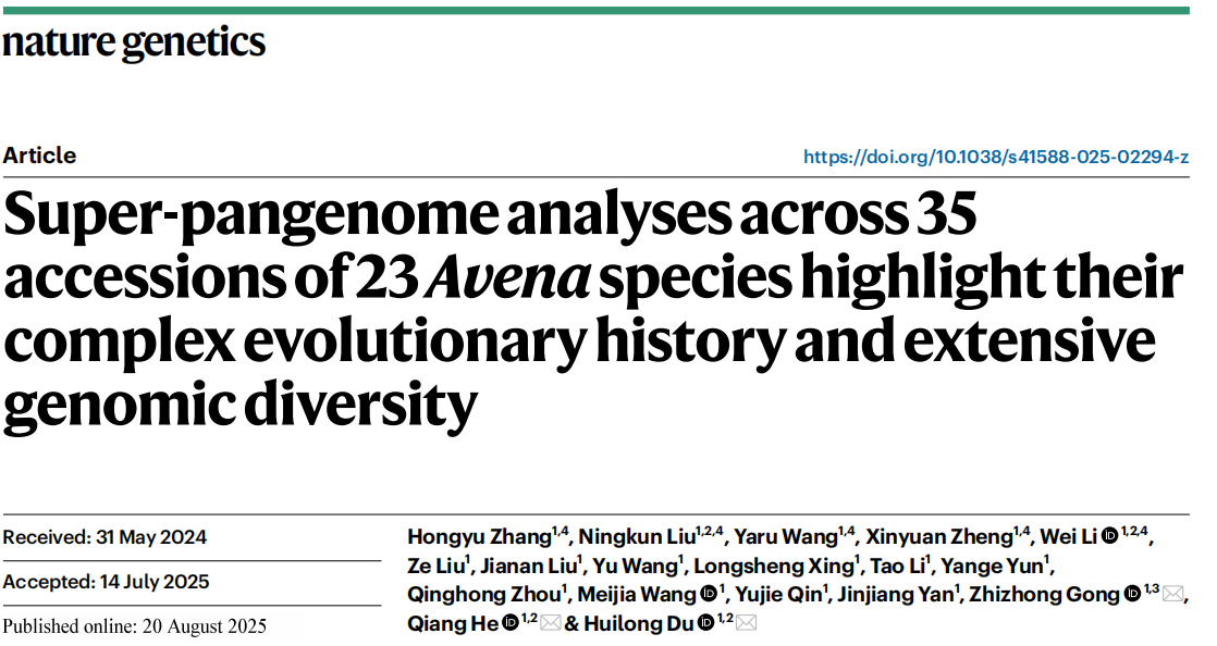 河北大学生命科学学院杜会龙教授及其科研团队于2025年8月20号在著名期刊《Nature Genetics》上发表了一篇名为“Super-pangenome analyses across 35 accessions of 23 Avena species highlight their complex evolutionary history and extensive genomic diversity”的重要论文,构建了一个包含35个高质量基因组的超级泛基因组,通过系统发育分析揭示了燕麦属的起源与进化,特别是与抗逆性等重要性状相关的遗传资源,为燕麦的基因组学研究和分子育种提供了宝贵的基础。