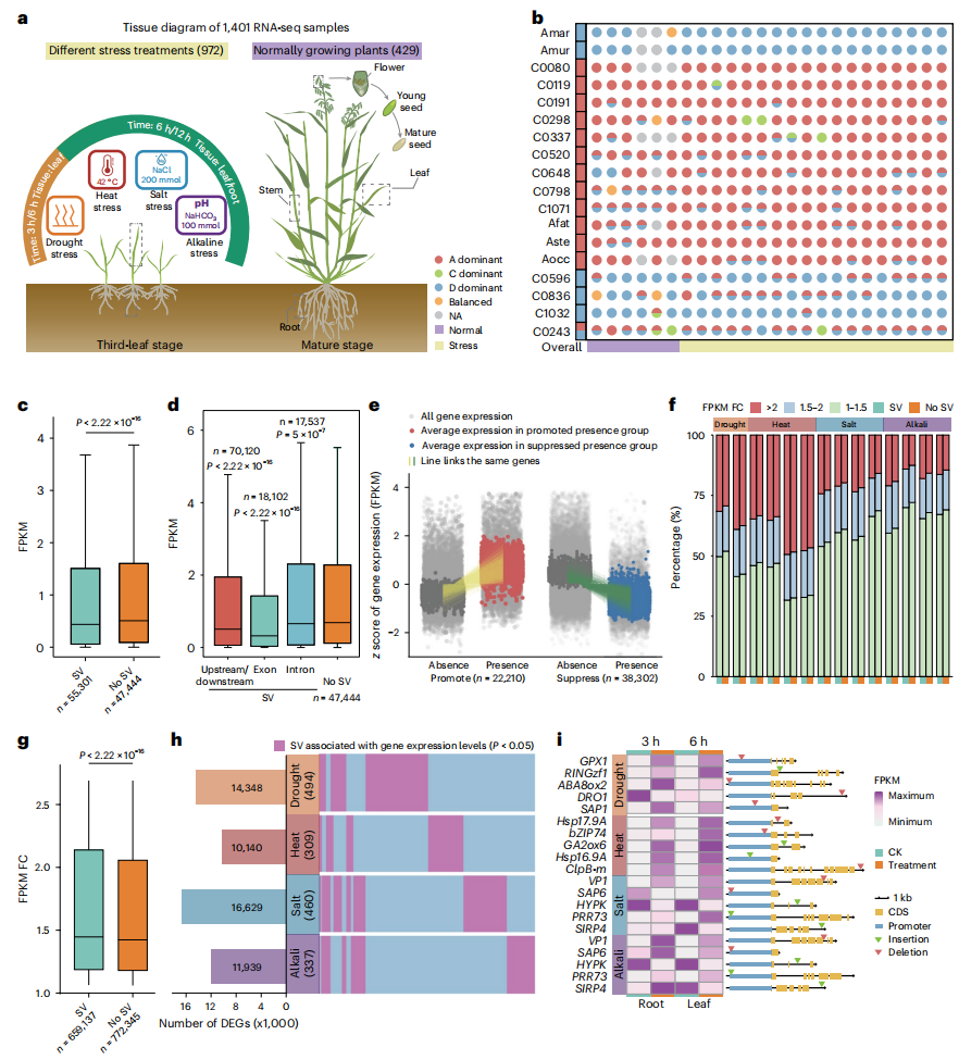 作者通过对17份六倍体燕麦材料的1401个RNA测序样本进行分析,系统揭示了结构变异(SV)在基因表达调控和胁迫响应中的作用。结果显示,C亚基因组的整体表达水平普遍受到抑制,而A与D亚基因组在不同材料中呈现动态的优势切换,提示其在功能创新过程中可能经历了新功能化或亚功能化。作者共鉴定出70132个SV相关基因,这些基因整体表达量显著低于非SV基因,且更易沉默,其中位于编码区的SV对基因表达的影响尤为突出。进一步分析表明,在干旱、高温、盐和碱等胁迫条件下,SV基因的表达变化幅度显著高于非SV基因,表现出更强的环境敏感性。在各类胁迫处理中,作者共检测到约1.0-1.6万个差异表达基因,这些基因主要参与防御反应、脱落酸信号以及热休克蛋白结合等功能。此外,作者还鉴定出多个与SV显著关联的基因(如DRO1、OsGA2ox6、OsPRR73及OsVP1),并证实其在胁迫响应中发挥关键作用。