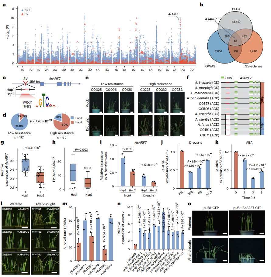 作者对186份燕麦材料进行基于结构变异(SV)和SNP的全基因组关联分析,鉴定出2223个与抗旱性相关的SV及3154个候选基因。结合表达谱和SV-eGene分析,作者进一步确认了13个显著候选基因。特别是,作者发现AsARF7基因附近的SV与抗旱性高度相关(P = 7.76 × 10⁻²³),且该SV在80%的高抗旱材料中存在。通过表型和转录组分析,作者证实该SV显著调控AsARF7的表达,从而影响抗旱性。功能验证结果显示,沉默AsARF7基因可增强燕麦的抗旱性,而过表达则削弱其耐旱能力。