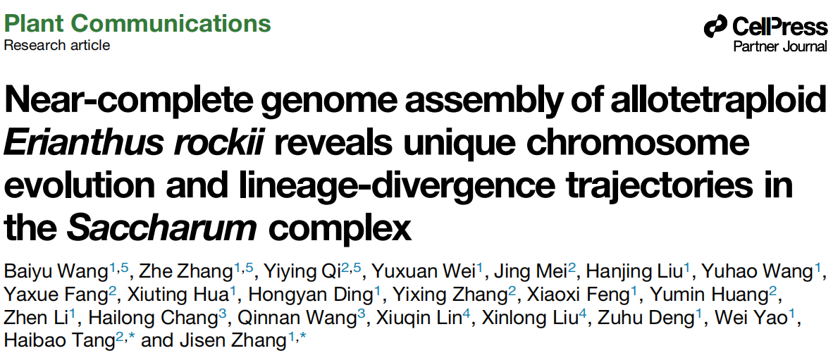 广西大学生命科学与技术学院张积森团队在著名期刊Plant Communications上发表了题为“Near-complete genome assembly of allotetraploid Erianthus rockii reveals unique chromosome evolution and lineage-divergence trajectories in the Saccharum complex”的研究论文。该研究组装了滇蔗茅的高质量四倍体基因组并揭示了其基因组由两个亚基因组融合而成,且经历了复杂的染色体重排和进化过程,为甘蔗的抗逆性育种提供了潜在的遗传资源和理论依据。