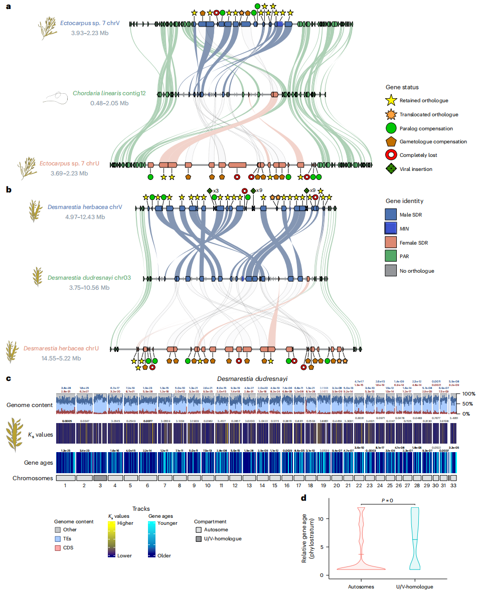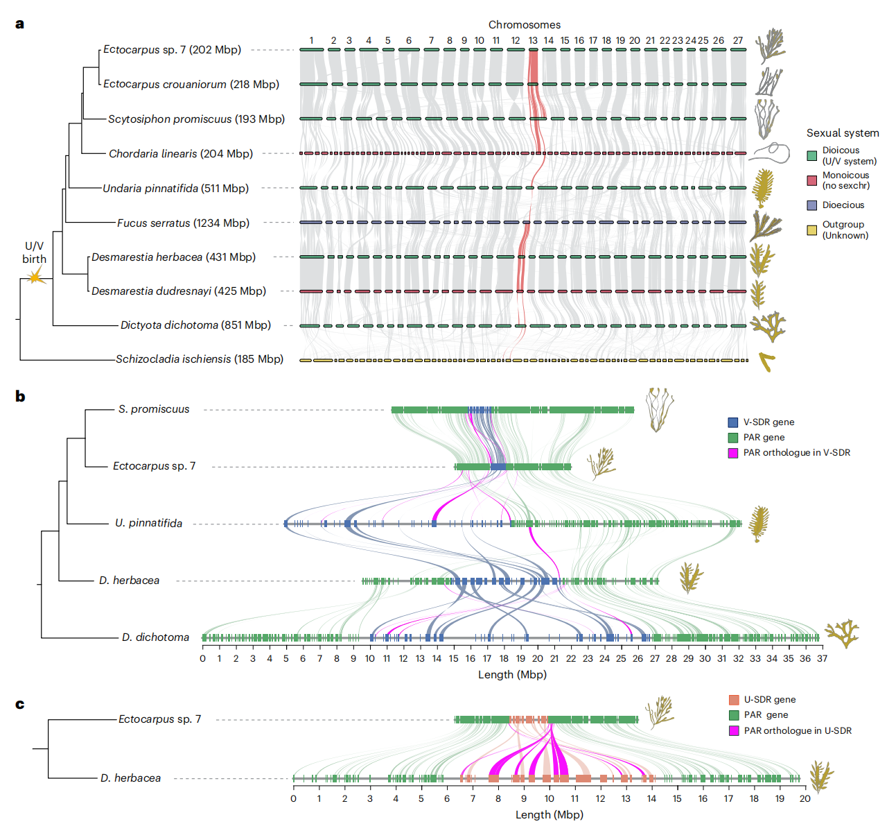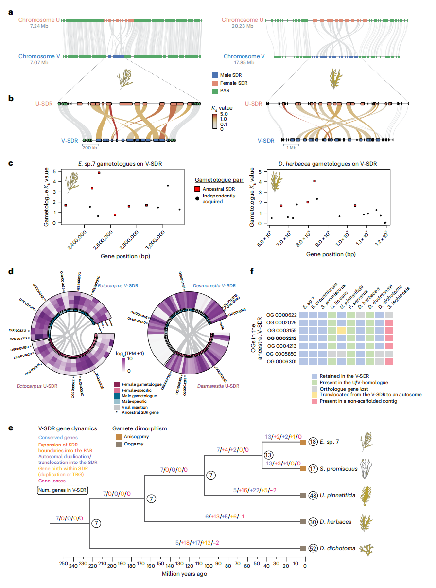 研究发现,褐藻的U和V的SDR中含有同源基因,表这明它们源自共同的祖先区域。而在Ectocarpus sp. 7 和 D. herbacea 的 U/V-SDR 中,配子对和性别特异性基因的比率相似,尽管两物种的 U/V-SDR 基因总数不同。两物种的 SDR 区域中仅有十个基因为同源基因,其余则为物种特有基因。在 Ectocarpus sp. 7 中保留的一个基因在 D. herbacea 中已经丧失。两物种共有五对配子在雌雄染色体上都保留了副本,而另有三对配子在 D. herbacea 中仅保留了单副本,即雄性或雌性基因缺失。