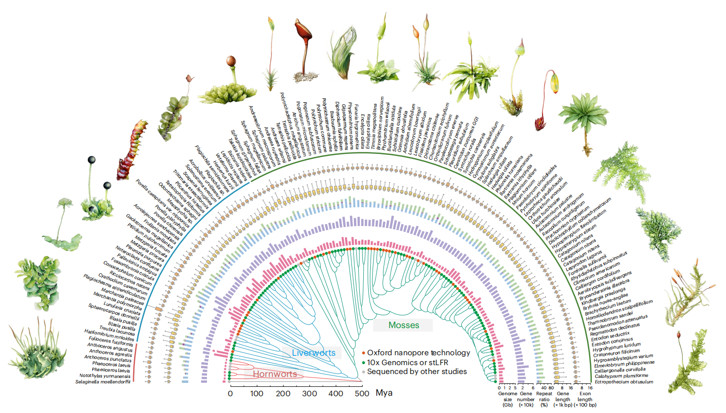 植物陆地化是地球生命演化的关键转折点,形成了现代陆地生态系统。现存约40万种陆地植物分为两大类:苔藓植物(约2.2万种)和维管植物,二者约在5亿年前分化。苔藓植物结构简单,缺乏维管组织和根,以配子体为主导世代,依赖孢子体获取营养,但其独特的抗旱等生理适应性使其在极端环境中广泛分布。尽管基因组研究显示苔藓植物为单系群,是维管植物的姐妹群,但其基因组多样性仍知之甚少。目前55个苔藓植物目中仅8个完成基因组测序,约70个陆生植物目缺乏基因组数据,严重制约了对陆地植物进化机制的理解。填补这一空白对揭示苔藓植物与维管植物基因组进化差异至关重要。