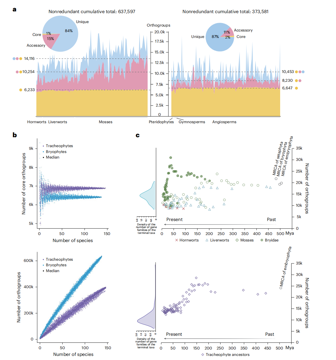 仙湖植物园刘阳及其研究团队于2025年9月22日在国际著名期刊nature genetics上发表题为“Bryophytes hold a larger gene family space than vascular plants”的研究论文,该研究中基于对123个新测序苔藓植物的基因组组装,发现苔藓相较维管植物拥有更大的基因家族空间,这些特征主要源于持续的新基因产生与水平基因转移,并塑造了其独特的适应性基因组格局。