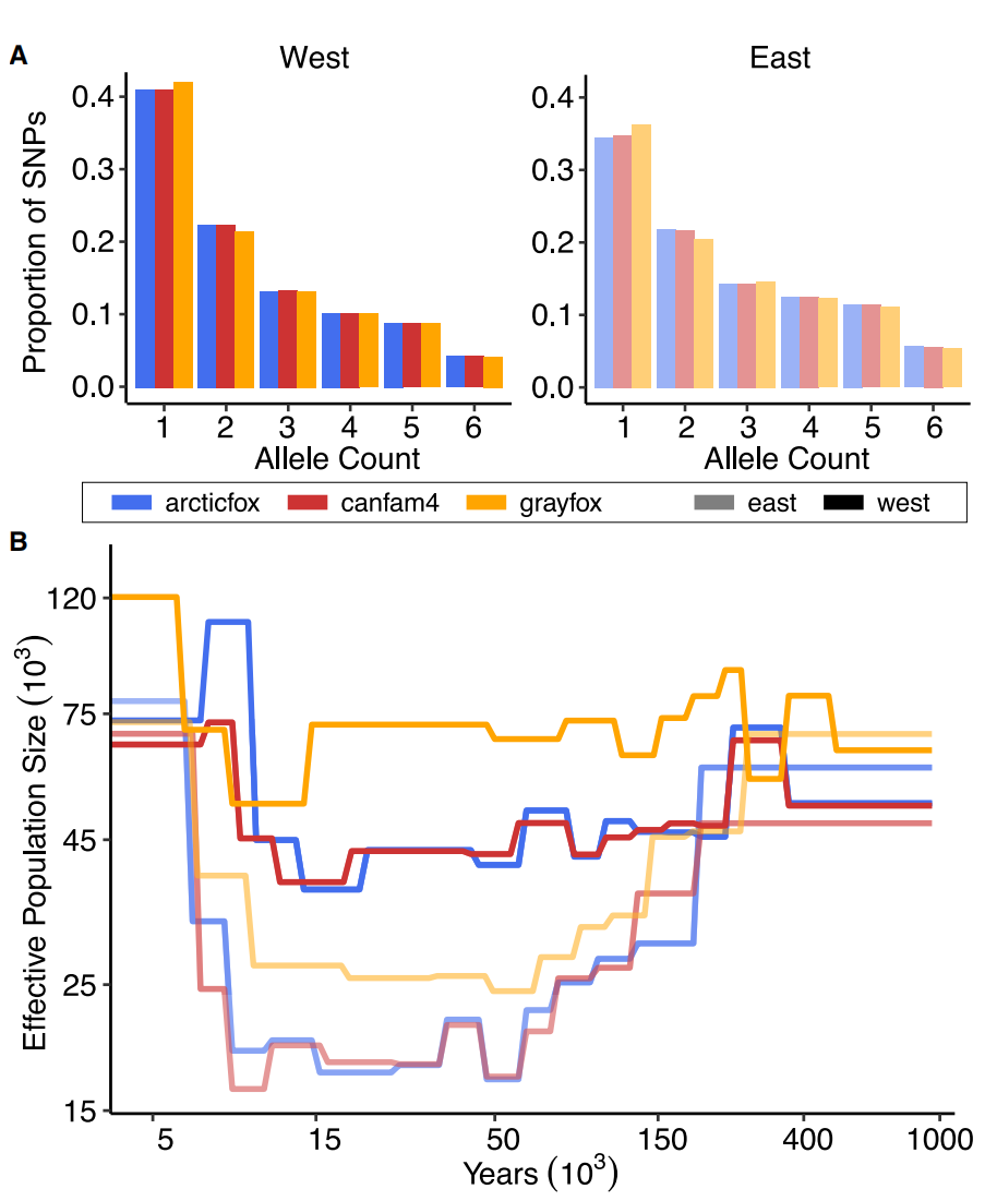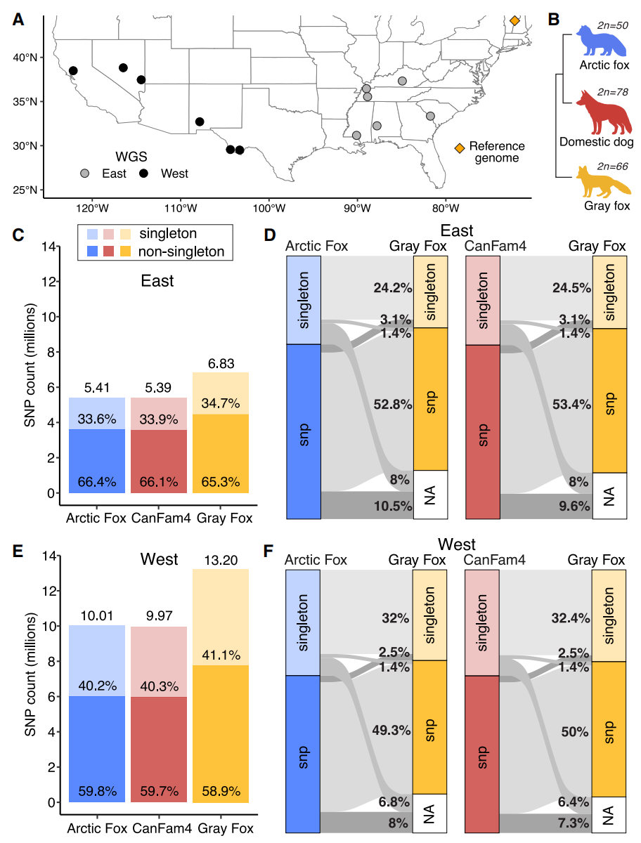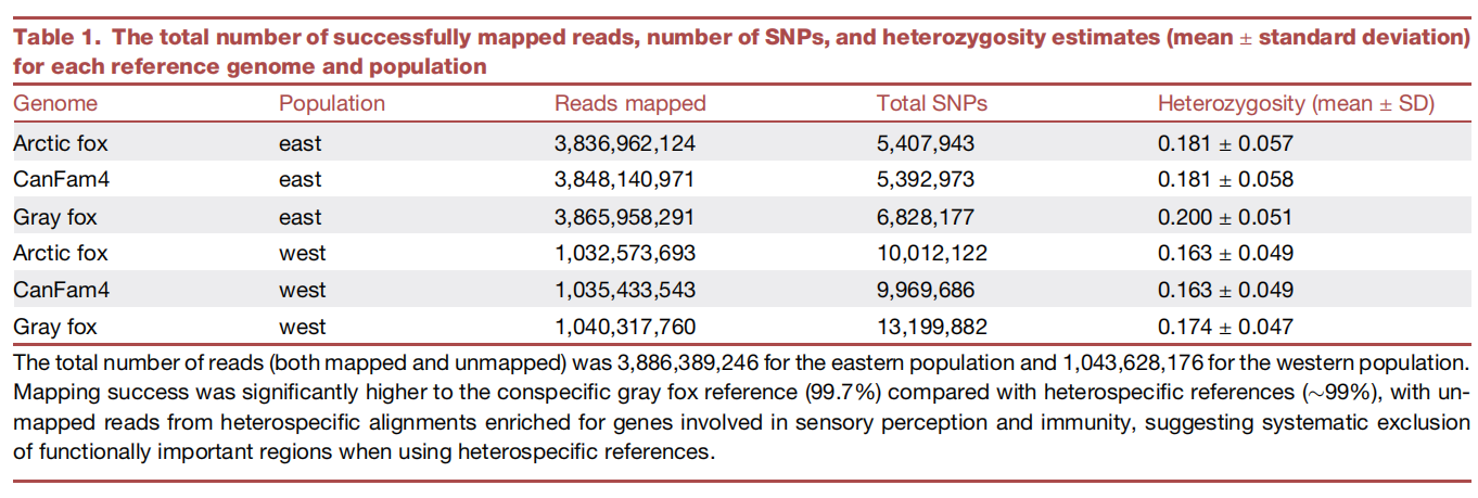 作者对比了使用灰狐(同种)、家犬CanFam4基因组和北极狐(异种)参考基因组时,灰狐东部和西部种群遗传变异及等位基因频率谱(SFS)的估算差异。结果表明,使用灰狐参考基因组检测到的SNP数量比异种参考高出26%-32%,且东部和西部种群的单例变异分别多出约33%和35%。此外,灰狐参考基因组的SNP平均深度稍高,且缺失率最低。在将异种参考基因组的SNP映射至灰狐基因组后,约80%的变异仍被识别,其中约50%-53%为非单例SNP。未映射的变异中,14%-18%未在灰狐参考中被识别,其中一半映射至不变位点,另一半则没有匹配。