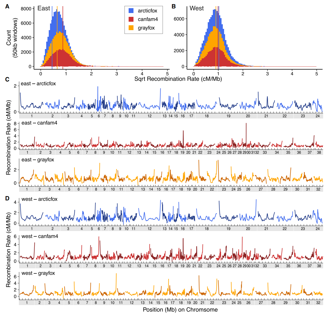 作者利用pyrho方法分析了东、西部种群在不同参考基因组下的重组率,发现参考基因组选择显著影响推断结果。在东部种群中,北极狐基因组推断的重组率比灰狐低约31%,而CanFam4高估约34%;在西部种群中,两种异源基因组均高估重组率,分别高出13%和9.5%。整体来看,东部差异更明显,异源基因组分别导致低估和高估,而西部则普遍表现为高估。进一步的50-kb窗口分析表明,异源基因组不仅增加了重组率的变异性,特别是在染色体末端,还显著提高了最大重组率。例如,东部种群的灰狐基因组最大重组率为7.34cM/Mb,而使用北极狐和CanFam4基因组时分别升高至14.9和23.4cM/Mb;在西部种群中,灰狐基因组的最大重组率为11.6cM/Mb,而北极狐和CanFam4基因组分别升至24.9和14.5cM/Mb。结果表明,异源参考基因组可能系统性地高估重组率,尤其是在高值区间,进一步强调了参考基因组选择在推断重组率准确性中的关键作用。