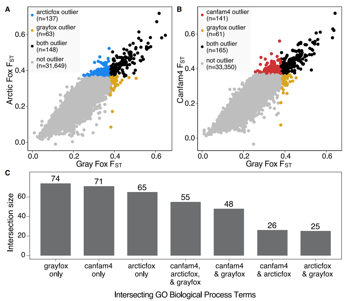 通过对 Fₛₜ 异常窗口进行 GO 功能富集分析,作者发现不同参考基因组不仅能够捕获部分重叠的生物学过程,还呈现出各自独特的信号。其中,灰狐基因组具有最多的特有术语(74 个),Canfam4 和北极狐分别为 71 个和 65 个。虽然三者间共有 55 个术语,但总体上特有术语数量更多,且灰狐与 Canfam4 的重叠度高于灰狐与北极狐。