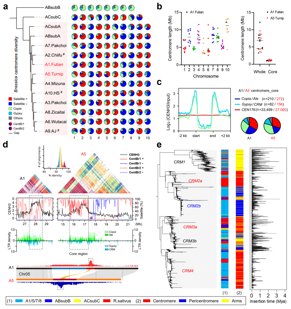 本研究成功组装了9个芸薹属植物基因组,涵盖7个不同白菜型油菜(B. rapa,AA基因组)材料,以及两个异源四倍体物种—芥菜(AABB)和油菜(AACC)。其中,福田品系实现了端粒到端粒(T2T)水平的完整组装。本研究覆盖了A、B、C三大主要基因组谱系,并构建了芸薹属首个系统性的泛着丝粒图谱。结果显示,着丝粒区域被大量反转座子侵入,结构呈现显著多样性:A与C基因组主要富集CEN176卫星序列,而B基因组则因卫星序列缺失,主要由Copia反转座子所替代。进一步分析表明,CentBr2为古老卫星类型,逐渐被CentBr1取代;B基因组中CENH3的突变则导致其卫星序列退化。DNA甲基化与CENH3分布模式表明,功能核心区呈现低CHG甲基化水平并富集CENH3。基于上述发现,本研究提出了芸薹属着丝粒的进化模型,为理解植物着丝粒的动态演化及合成染色体设计提供了新的理论依据。