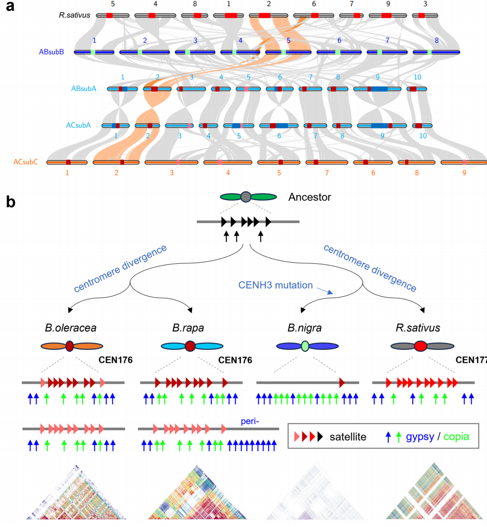在十字花科基因组中,着丝粒及其邻近区域表现出快速演化特征。进化分析表明,拟南芥与芸薹属约在2000–3500万年前分化,两者着丝粒卫星序列同源性仅约50%。此后,芸薹属经历了一次全基因组三倍化,并迅速与萝卜分化,二者着丝粒卫星序列同源性为75%。萝卜具有最长的着丝粒,主要由CEN177卫星构成;而亲缘较近的黑芥因BnCENH3蛋白突变,丢失了着丝粒卫星。为弥补B亚基因组中卫星序列的退化,其着丝粒区域积累了更多Copia逆转录转座子,邻近区则富集了更多Gypsy元件。