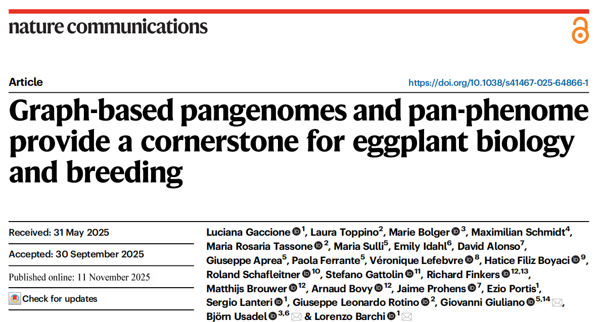 国外研究团队于2025年11月11日在Nature Communications上发表了题为“Graph-based pangenomes and pan-phenome provide a cornerstone for eggplant biology and breeding”的研究论文,构建了覆盖栽培与野生茄子遗传多样性的核心材料库,并基于长短读测序建立图谱化泛基因组;同时通过泛基因组关联分析系统解析了茄子的演化历史及刺、抗病性和代谢物含量等关键性状的遗传机制。