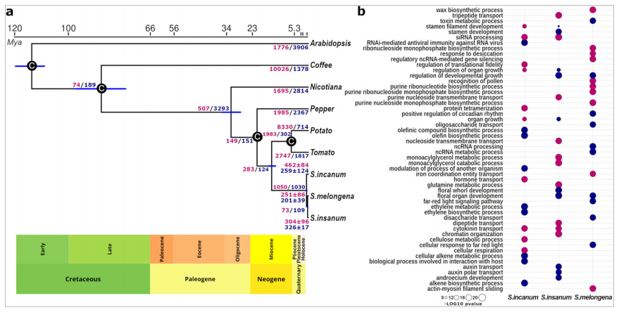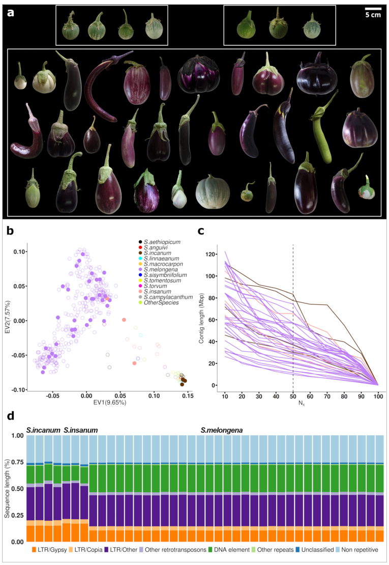 研究基于来自105个国家的3412份全球茄子材料,构建了包含368份代表性材料的全球茄子核心种质库,其中涵盖栽培茄子与其野生近缘种S.insanum和S.incanum。研究团队对全部材料开展短读长测序,并对40份具有代表性的材料进行了Nanopore长读长测序和部分Hi-C测序,获得高质量染色体级基因组,基因组大小约1.10-1.14Gb,BUSCO完整度达98%左右,均达到参考级别。基因组分析表明,重复序列占比超过70%,以LTR-RT为主。系统发育分析显示,栽培种与两种野生种之间的关系受到杂交、基因渗入等因素影响,其分化时间约为0.75Mya与0.29Mya。