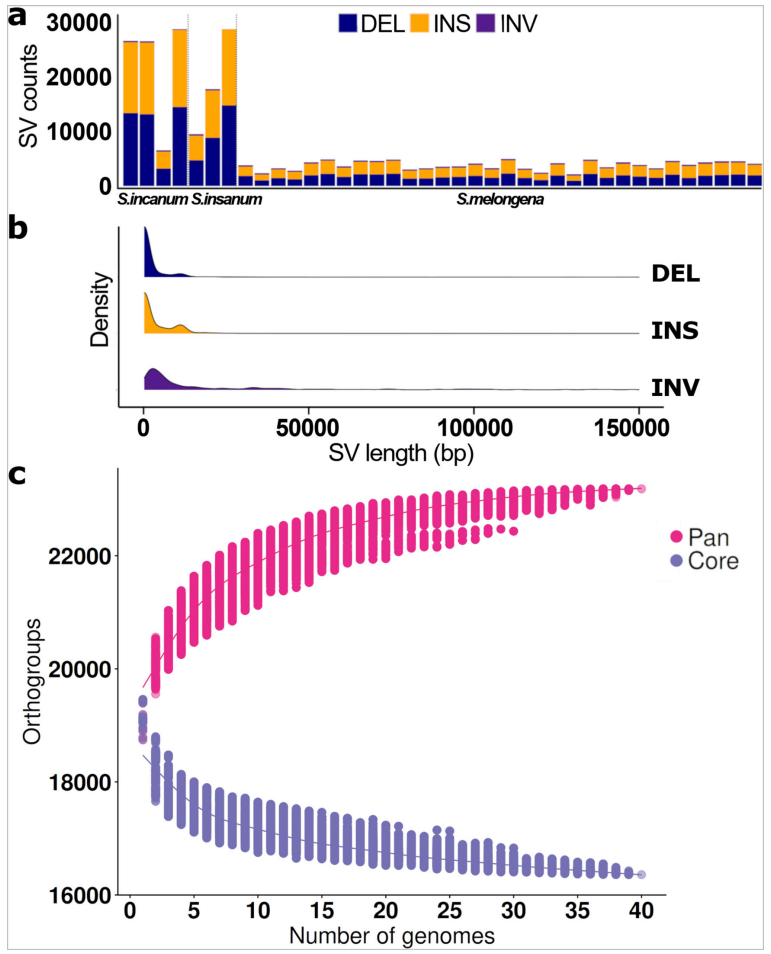 为全面揭示茄子类群的遗传多样性并避免对单一参考基因组的偏倚,基于40份染色体级高质量基因组,构建了规模达2.94Gb的与参考无关的泛基因组(PG-SMA),较已有参考泛基因组扩大一倍以上,检测到8.3万余个结构变异。系统分析显示S.incanum与S.insanum并未形成独立类群,而是相互交错,与基因树结果一致。PG-SMA结构揭示约40%的可丢弃基因组与约50%的核心基因组,表明茄子类群基因组具有高度可塑性。