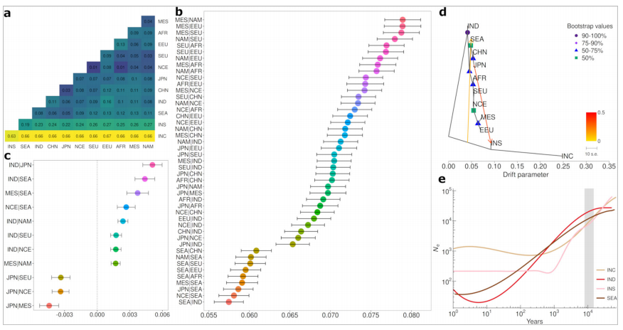 作者结合SNP和SV数据,采用FST评估了不同种群间的基因分化。研究发现,茄子与其野生亲缘种S. insanum的基因分化程度最大,其次是与S. incanum的基因分化。在茄子种群中,来自东南亚、印度和日本的种质与S. insanum的基因亲缘关系最为密切,进一步支持东南亚作为茄子的主要驯化中心的推论。D统计分析进一步确认了从S. insanum向东南亚、印度和日本种质的非对称基因流动,而欧洲品种的基因内流较少。研究还分析了茄子的驯化与迁移历史,结果表明最可能的迁移路径为从S. insanum向东南亚茄子种质的基因流动,以及日本/韩国种质回流至S. insanum。人口学建模显示,S. insanum和S. incanum的有效种群数量大约在40-45千年前的冰川最大期经历了瓶颈,而茄子来自东南亚和印度的种质则在约15千年前遭遇了更为近期的瓶颈,符合茄子驯化的时间框架。