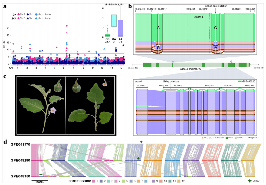 本研究通过构建茄子栽培种S. melongena及其野生亲缘种S. insanum 和 S. incanum的泛基因组,深入分析了茄子的遗传多样性和重要农艺性状的遗传基础。研究结合多个不同性状样本的短读和长读测序技术,构建了两个泛基因组图谱,并通过泛基因组关联分析(Pan-GWA)找到了多个关键性状的控制基因:6号染色体上的LOG3基因与茄子果实刺毛发育相关,11号染色体的RPP13-like抗病基因簇与茄子的抗枯萎病性状密切相关, GDSL脂肪酶样基因参与绿原酸代谢过程。研究还揭示了茄子在东南亚和印度次大陆的独立驯化过程,并且指出野生种与栽培种之间的基因流动对当前茄子遗传结构的形成起到了重要作用,为茄子的基因组学研究和未来基因组辅助育种提供了宝贵的遗传资源。