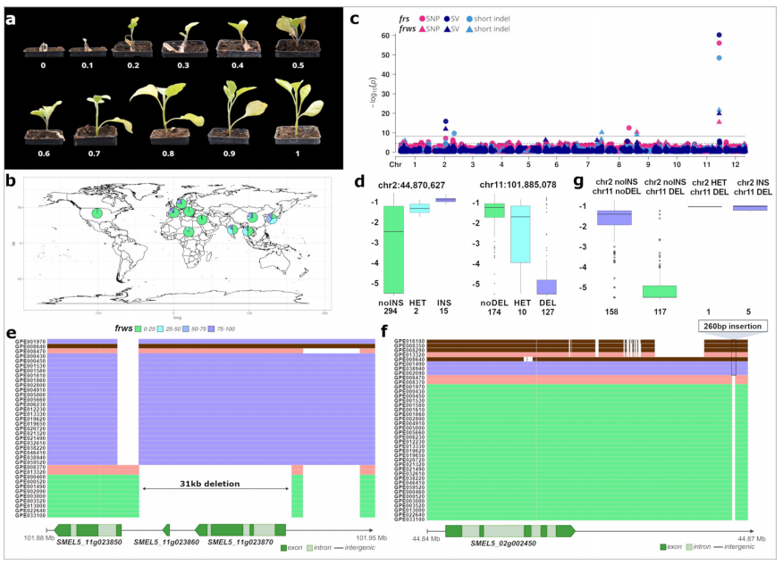 为了探究茄子抗尖孢镰刀菌的关键分子机制,作者通过全基因组关联分析结合泛基因组结构变异分析在染色体2和11上鉴定到两个主要QTL,其中染色体11的RPP13-like抗病基因簇是核心抗性来源;染色体2的QTL对应一个260 bp插入,其邻近的AHL家族基因SMEL5_02g002450可能参与胁迫响应。泛基因组分析显示,易感材料中在SMEL5_11g023850第一外显子出现特异插入,并伴随约31 kb的大片段缺失,影响抗真菌蛋白基因SMEL5_11g023860及RPP13-like基因SMEL5_11g023870的完整性与表达。该缺失与感病高度相关,并在S. insanum与S. incanum中普遍存在,表明其为古老的结构变异并受到选择清扫作用。进一步分析显示,染色体2的插入在大多数野生近缘种中固定,而缺失该插入的材料通常易感;但只要染色体11上的RPP13-like基因簇保持完整,即便没有染色体2的插入依然可表现完全抗性。总体表明,茄子抗尖孢镰刀菌主要由染色体11的RPP13-like基因簇主导,并受到特定古老结构变异的调控。