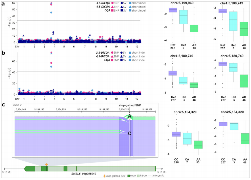 研究进一步探讨了茄子中绿原酸及其衍生物的代谢机制,通过全基因组关联分析识别了8个QTL,最强的位于染色体6,但未发现明确的候选基因。研究表明环境因素,如温度和光照,可能影响绿原酸的合成。此外,研究在染色体4(4.88-5.55Mb)上鉴定了一个主要QTL,显著影响茄子果皮和果肉中的异绿原酸含量。该区域内发现了SMEL5_04g005040基因,携带突变导致蛋白质非功能化。分析显示,高异绿原酸含量的茄子种质携带一个单倍型,而低含量的种质则携带另一种。大多数野生亲缘种(如S.insanum、S.incanum)天然积累较高水平的异绿原酸,并携带高积累单倍型,只有S.incanumGPE008640携带低积累单倍型。作者认为SMEL5_04g005040是决定茄子及其野生亲缘种异绿原酸含量的关键基因。