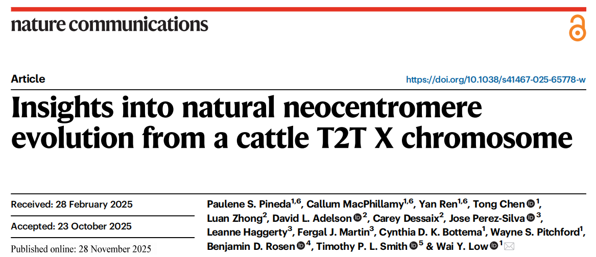 澳大利亚阿德莱德大学的研究团队于2025年11月28日在国际著名期刊Nature communication上发表了一篇题为“Insights into natural neocentromere evolution from a cattle T2T X chromosome”的研究论文,首次构建了来自和牛(Wagyu)的无缺口T2T X染色体及四条完整常染色体,并系统解析其着丝粒结构,发现其可能为天然形成的进化性新着丝粒,为理解着丝粒演化提供重要线索。
