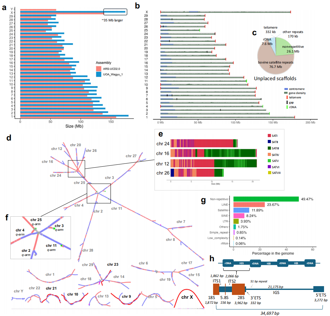 UOA_Wagyu_1基因组包含51%的重复序列,较ARS-UCD2.0的41%明显增加。在和牛中共检测到9个完整rDNA拷贝及190个未定位拷贝,复杂的rDNA阵列也阻碍了BTA4的完全组装。牛的rDNA单元约35kb,由高度一致的18S、5.8S、28S及变异显著的IGS组成。