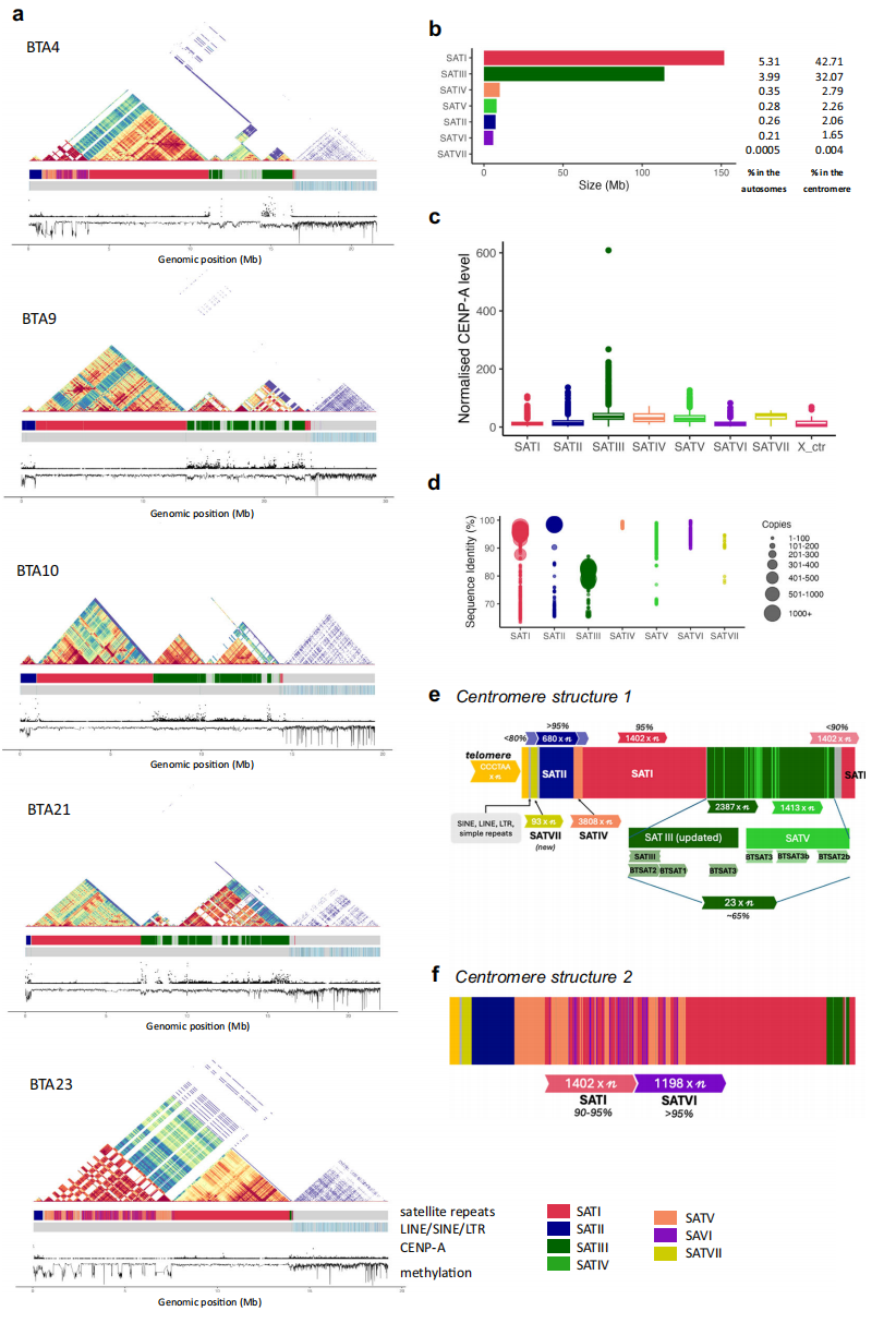牛着丝粒区域由多种卫星重复序列构成,由于近端着丝粒染色体含大量长串联重复,特别是BTA12、BTA16、BTA24与BTA26的结构高度相似,导致这些区域在组装中形成复杂缠结,难以跨越着丝粒至端粒。尽管如此,本研究成功获得五条跨越着丝粒的常染色体组装。分析显示,约84%的着丝粒由七类卫星重复组成,其中SATIII具有最强的CENP-A富集信号,提示其可能具备核心着丝粒功能。不同染色体间的卫星重复分布与拷贝数存在差异,但已解析的所有常染色体着丝粒均呈现统一的排列顺序:端粒、SATVII(伴随SINE/LINE和简单重复)、SATII、SATIV。根据SATI与SATVI的夹杂模式,常染色体着丝粒可分为两类结构类型,为理解牛着丝粒组织和演化提供重要依据。