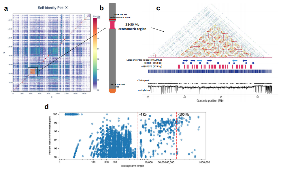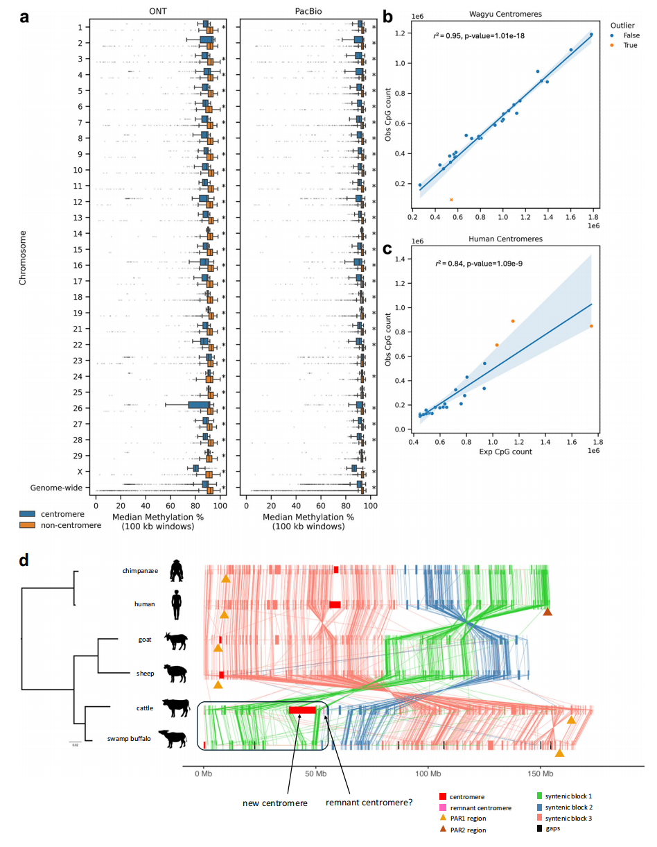 作者利用PacBio HiFi与ONT超长读长组装出近乎端粒到端粒的和牛基因组UOA_Wagyu_1,完整解析X染色体及4条常染色体,使基因组长度较现参提高16%,大幅补全着丝粒、端粒与rDNA等高度重复区域,并新增大量基因注释(尤其集中在X染色体)。研究解析常染色体着丝粒的7类卫星重复结构,发现牛X染色体着丝粒不同于典型哺乳动物结构,几乎不含卫星DNA,而由倒位重复与转座元件构成,且CENP-A富集、CpG密度与甲基化水平均异常低,揭示其为由转座扩增和CpG脱氨等机制驱动形成的天然新生着丝粒。作者进一步比较多物种X染色体与牛X-Y伪常染色体区,确认多基因在睾丸中具有保守表达模式,并构建20头和牛的结构变异图谱,为性染色体演化研究与育种应用提供高质量参考。