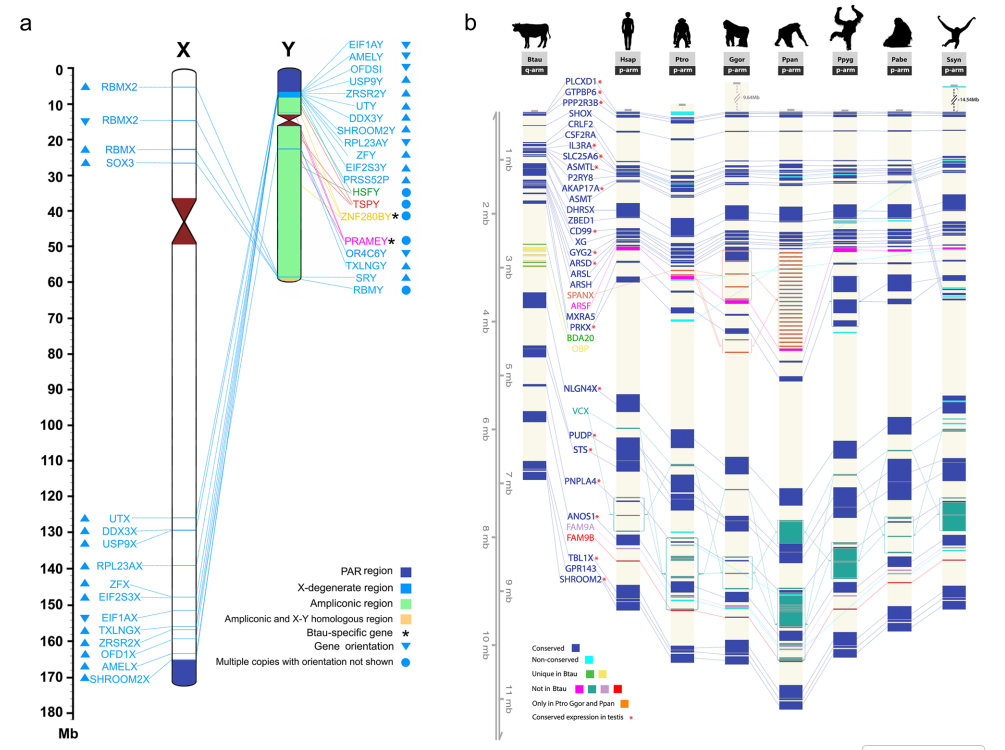牛的X-Y假常染色体区(PAR)具有显著的物种特异性。X-PAR位于Xq末端,Y-PAR位于Yp,并为多个比较物种中最长。两者包含31对同源基因,另有牛特有的PRP基因位于Y-PAR。牛在PAR中拥有灵长类缺乏的BDA20与OBP,并缺失多种灵长类共有基因。Y-PAR向外包含X-退化与扩增区,分别保留与X的同源基因或仅存在于Y的扩增基因。