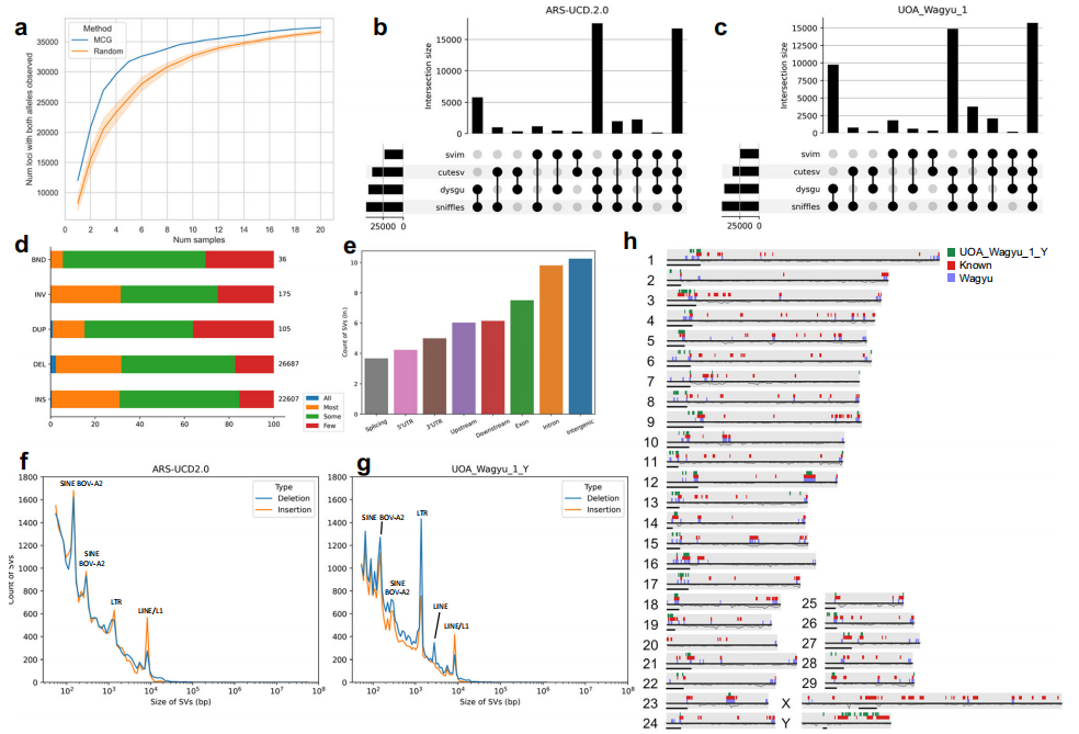 本研究采用最大捕获遗传多样性(MCG)方法优先选择最具代表性的种公牛,并逐步加入能补充未覆盖变异的个体,以在既定预算内最大化捕获遗传多样性。结果显示,在选取20头重测序样本时,MCG方法捕获的遗传变异明显多于随机抽样。利用四种结构变异(SV)检测工具对这20个样本进行分析,并分别以UOA_Wagyu_1_Y与ARS-UCD2.0为参考组装,共鉴定到约4.7-5.0万个SV,其中插入与缺失占主要部分,其余依次为倒位、重复和断点;多数SV分布在基因间区,其次为内含子和外显子区域。SV长度以短变异为主,并在约145bp与285bp(SINE-BOV-A2)、1300bp(LTR)及8500bp(LINE/L1)处出现峰值;UOA_Wagyu_1_Y中还存在约2700bp的LINE缺失峰。为识别和牛特异的基因组区域,本研究构建包含13个肉牛品种的泛基因组图,共鉴定到283,348个PAV,其中5840个为和牛特有。整合SV与PAV后共识别133个和牛特异性热点,并发现509个与其重叠的蛋白编码基因,多与嗅觉功能相关。